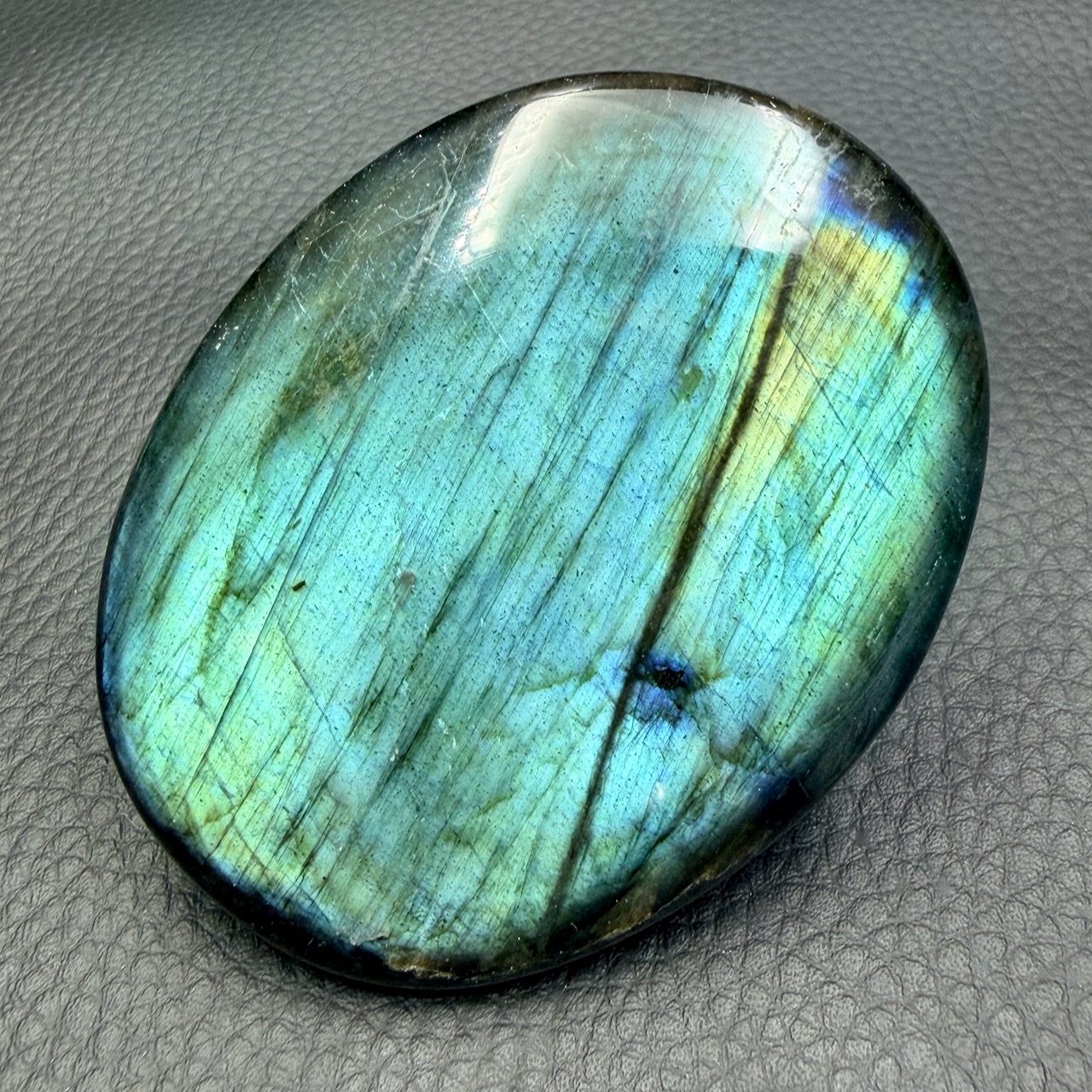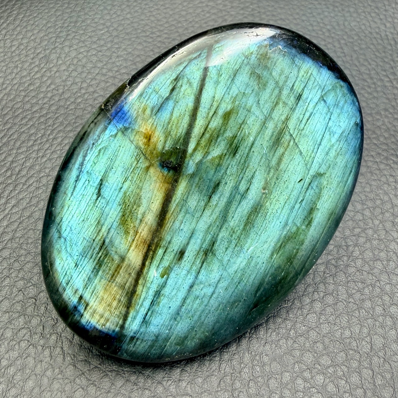 Dimensions du Galet de Labradorite 7,2 cm sur 6 cm sur 1,6 cm.