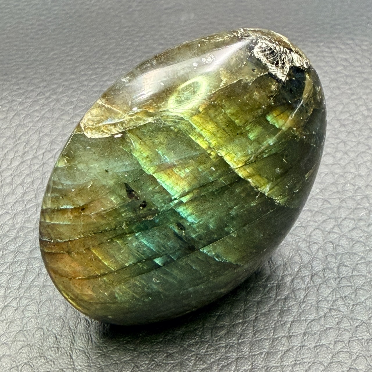 Dimensions du Galet de labradorite 5,4 cm sur 4,3 cm sur 2,4 cm.