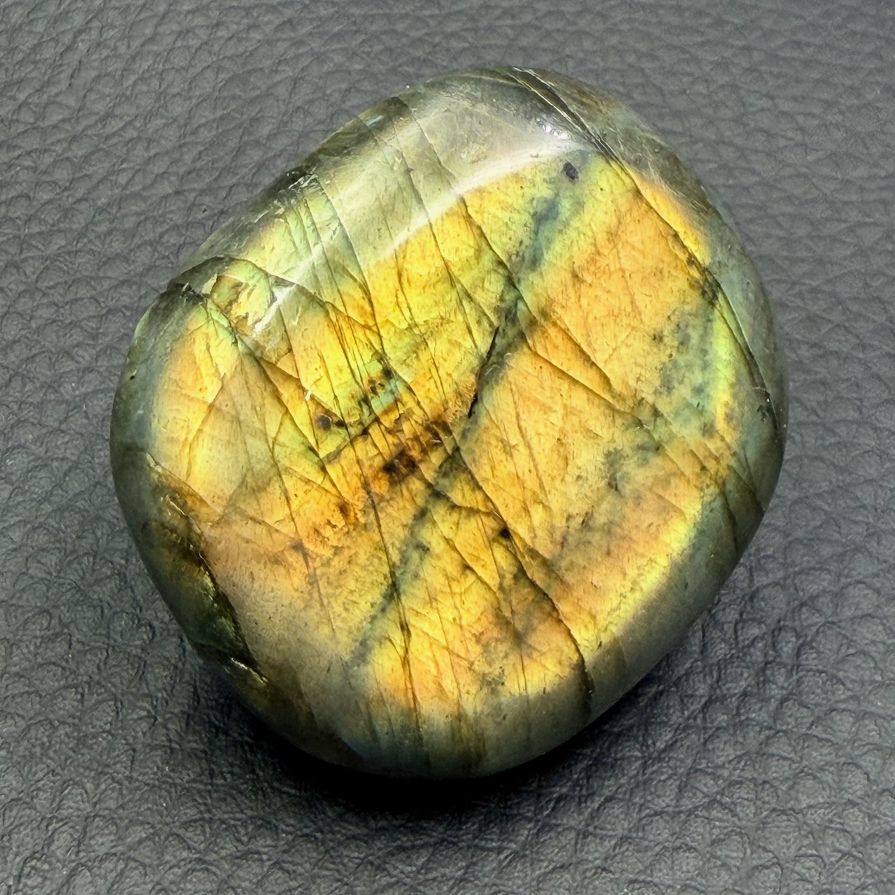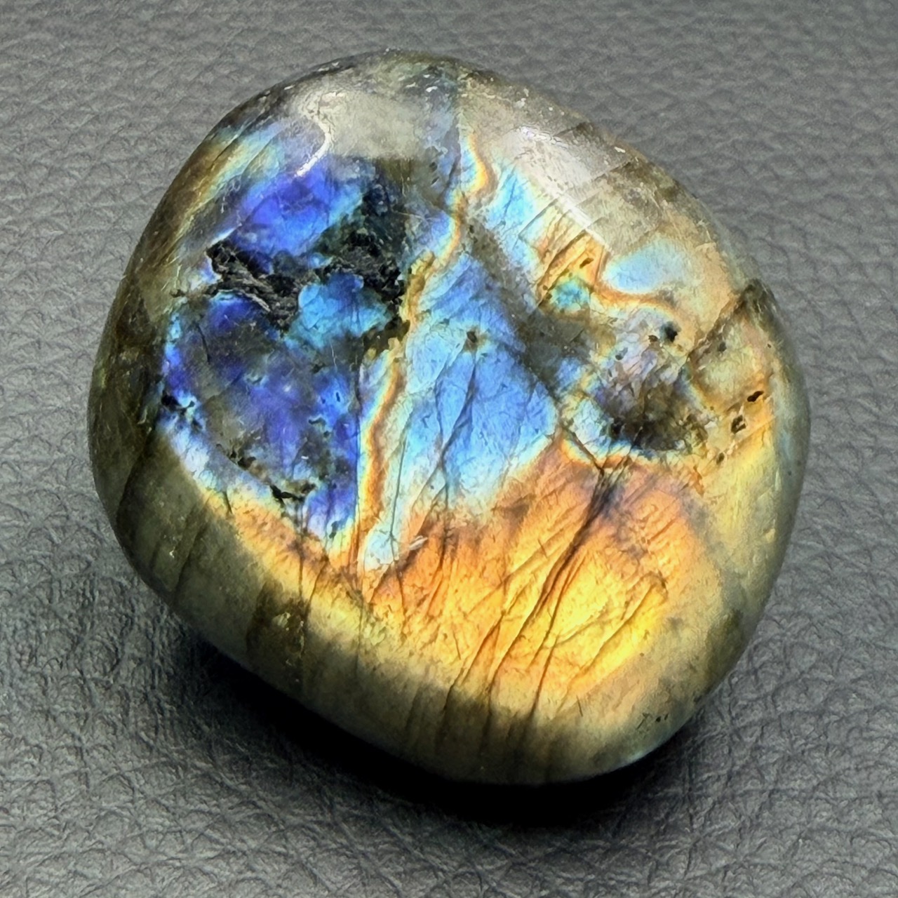 Dimensions du Galet de labradorite 4,7 cm sur 4,1 cm sur 1,8 cm.