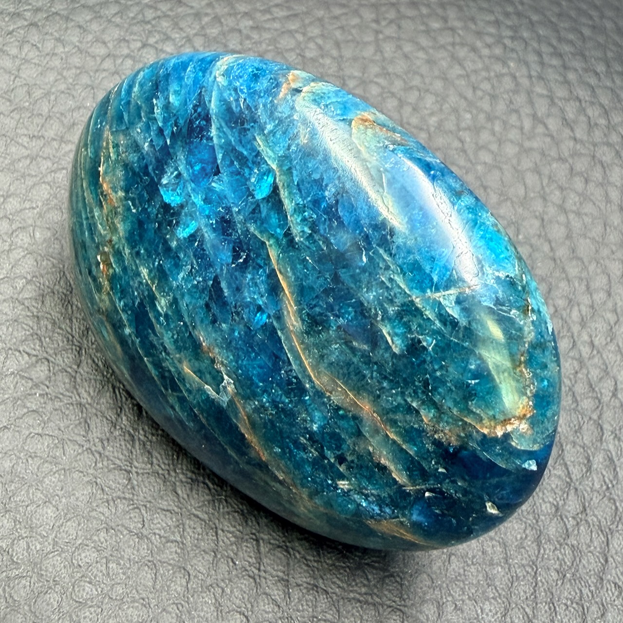 Taille du galet en apatite bleue 5,3 cm sur 4,1 cm sur 2,9 cm.