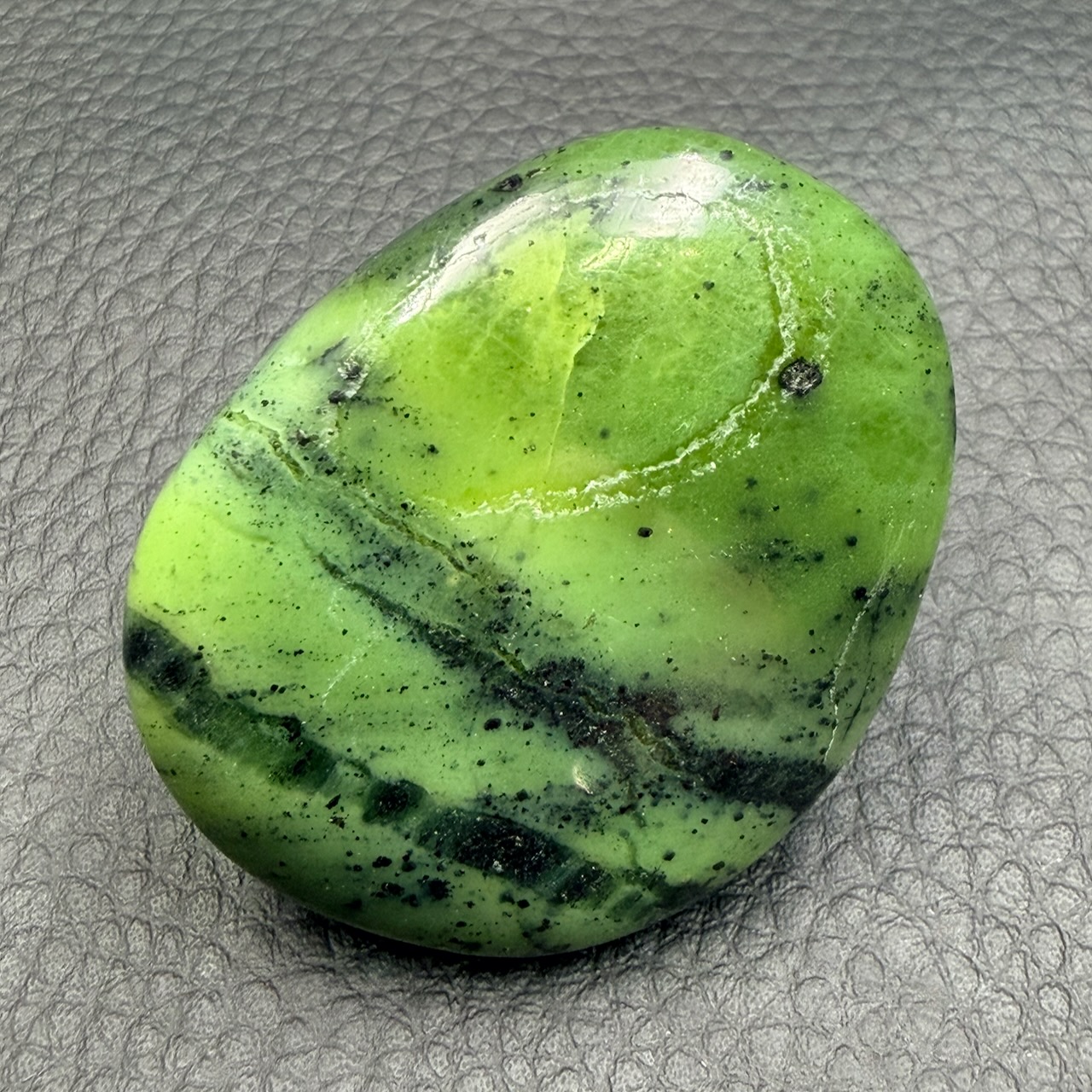 Taille du galet en jade 4,6 cm sur 3,8 cm sur 1,1 cm.
