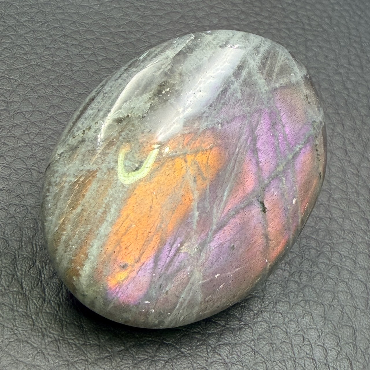 Dimensions du galet en Labradorite spectrolite 5 cm sur 3,8 cm sur 1,6 cm.