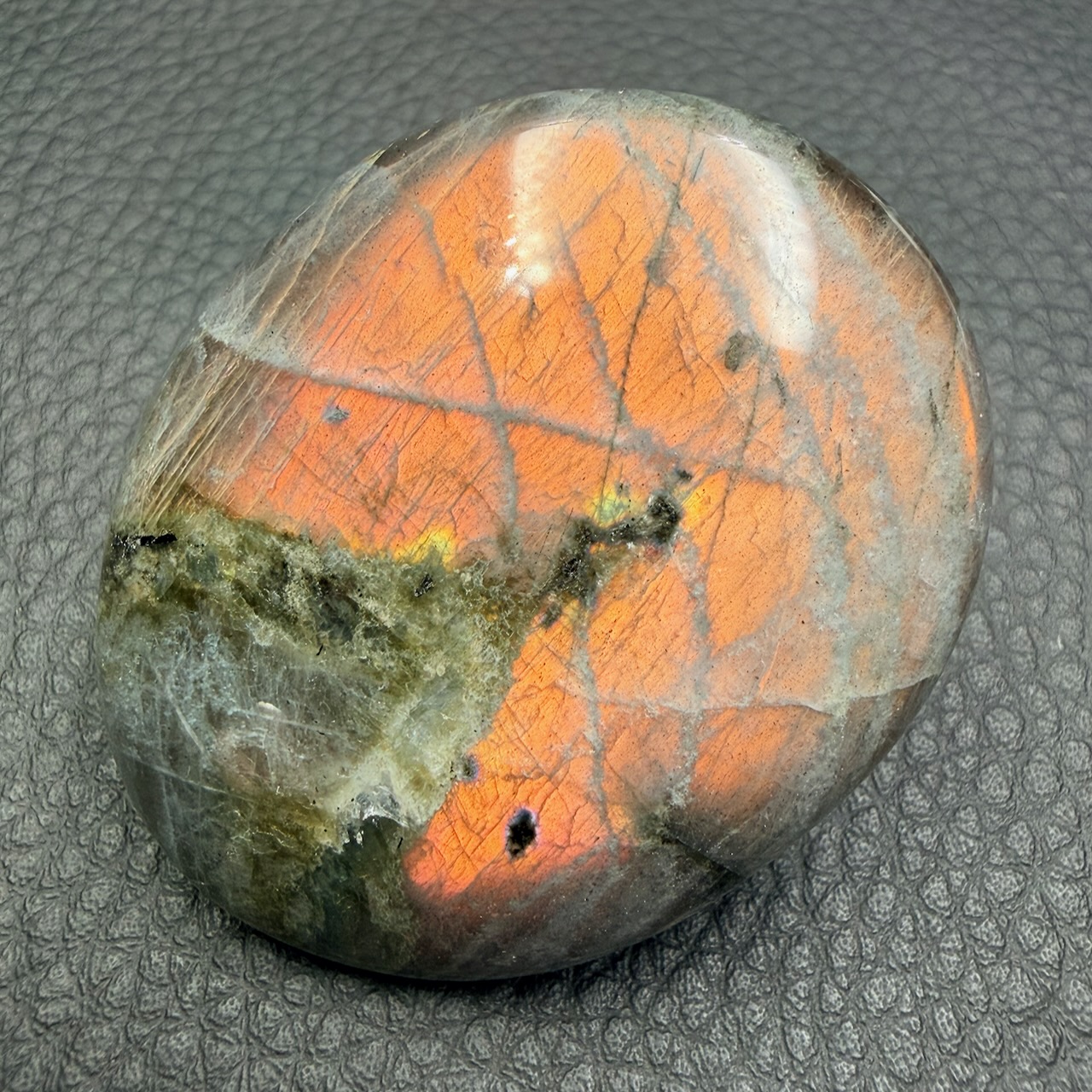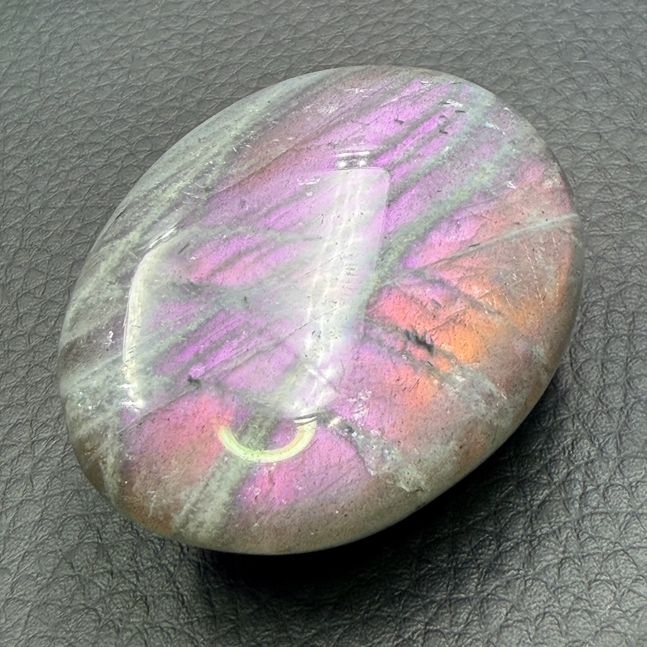 Le violet, en particulier, est une couleur rare dans la labradorite et provient de la diffraction de la lumière dans les couches internes de la pierre. Lorsqu’une source de lumière blanche atteint la surface du galet, une partie de la lumière est absorbée tandis qu’une autre est déviée.