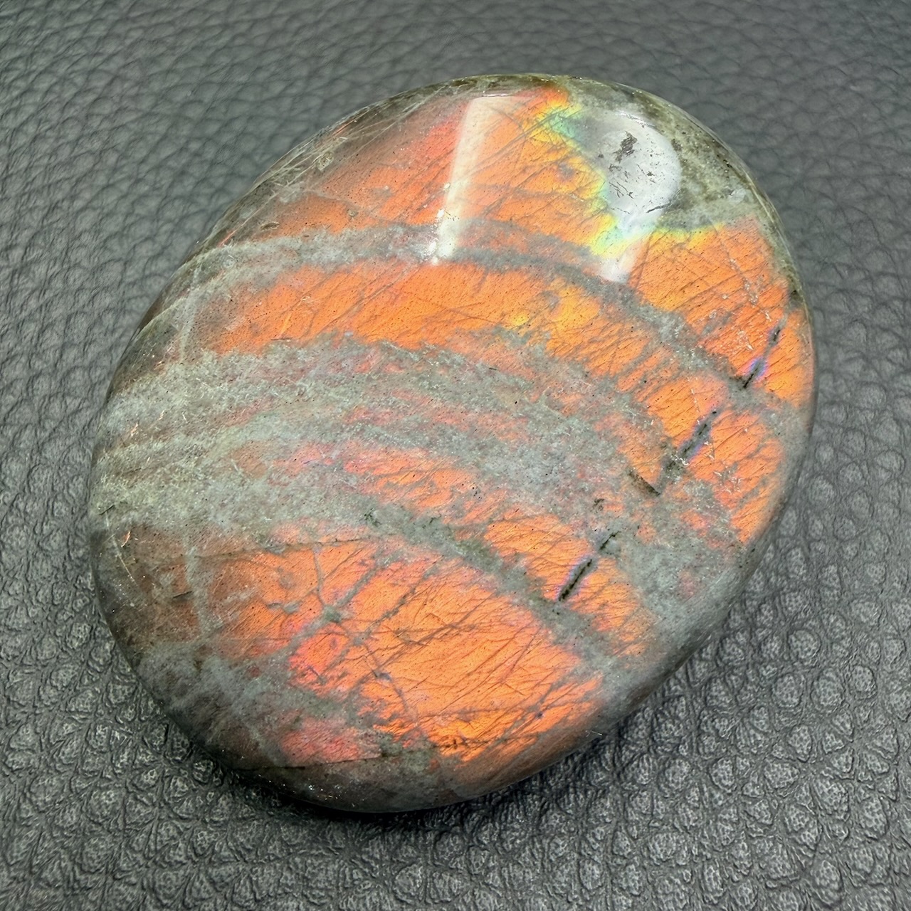 Ces lamelles sont en fait des micro-inclusions internes et des fractures dans le minéral qui, lorsqu’elles sont éclairées, décomposent et reflètent la lumière sous des angles variés.Le résultat est un effet visuel semblable aux reflets de l’arc-en-ciel, où les couleurs changent en fonction de l’angle de vue et de la source de lumière.