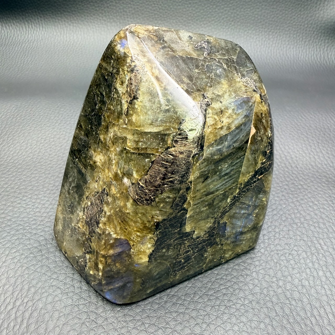 La particularité de certaines pièces de labradorite est de posséder un jeu de couleurs à l’éclat métallique.