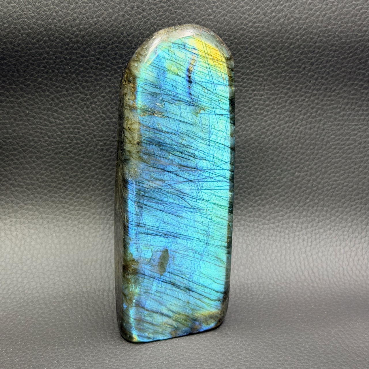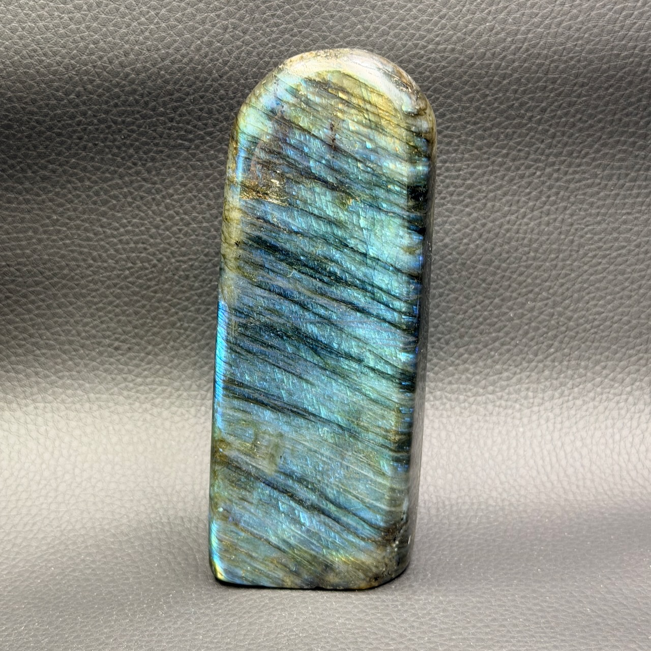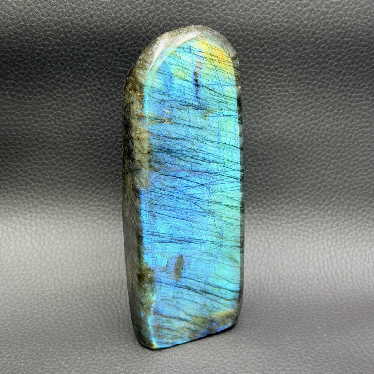 Taille de la labradorite Bleue 14,2 cm sur 5,4 cm sur 3,4 cm.