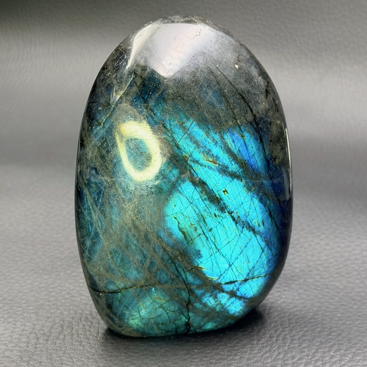 La particularité de certaines pièces de labradorite est de posséder un jeu de couleurs à l’éclat métallique.