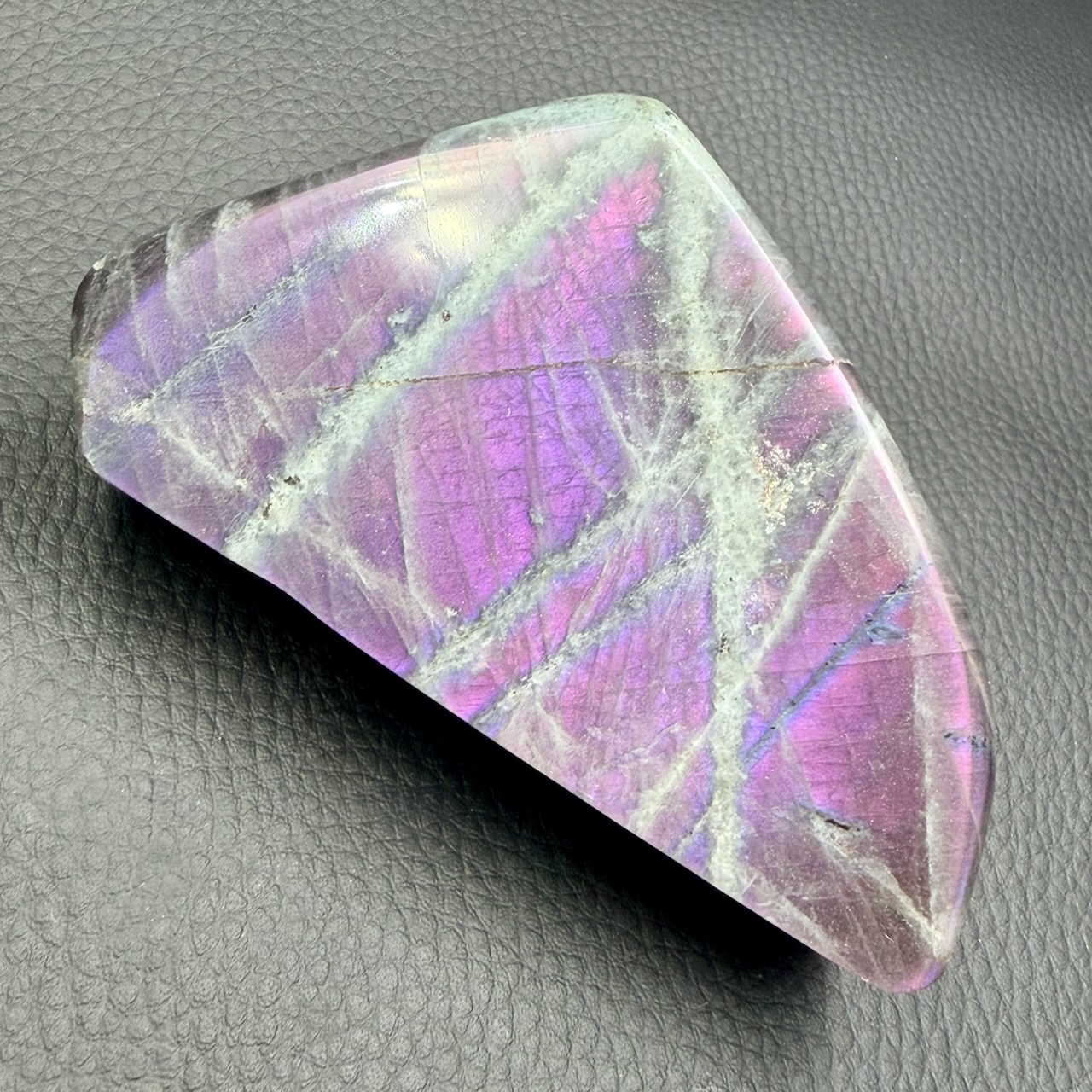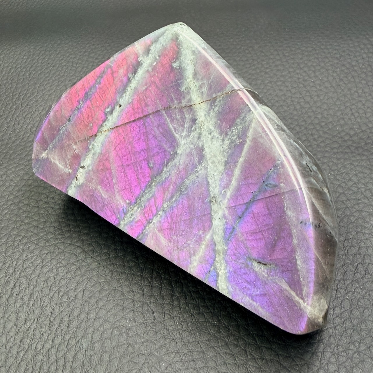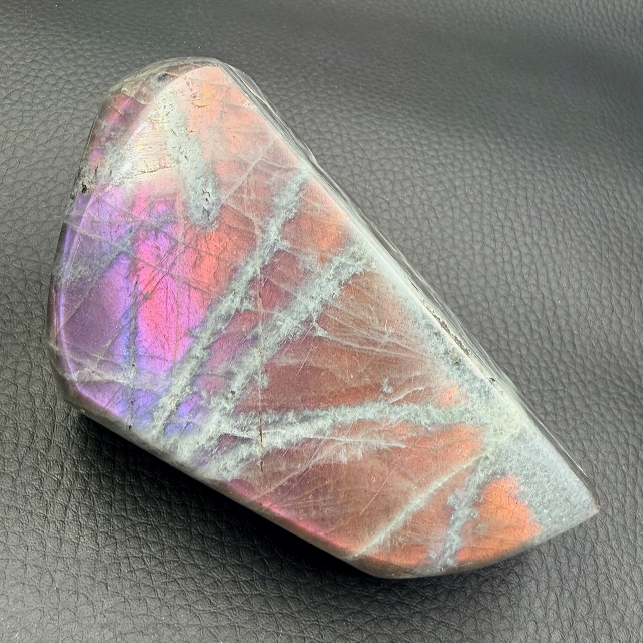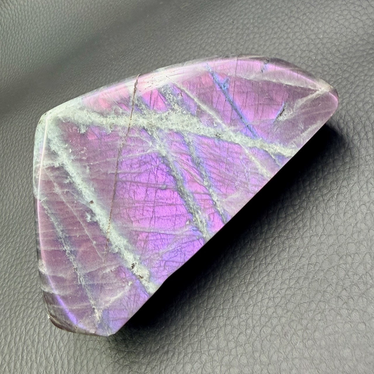 Le phénomène de labradorescence est l’un des aspects les plus emblématiques de la labradorite. Dans le cas de la variété violette, ce jeu de lumière prend une dimension encore plus spectaculaire. Les reflets violets sont extrêmement rares dans les gemmes naturelles, car ils nécessitent des conditions géologiques et chimiques précises.