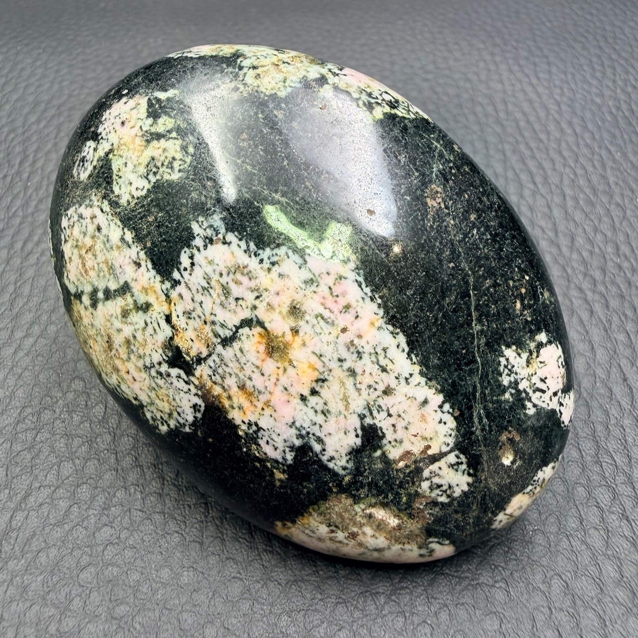 L’obsidienne flocon de neige contient des cristaux de minéraux blancs qui créent des motifs distincts à l’intérieur de la roche vitreuse.