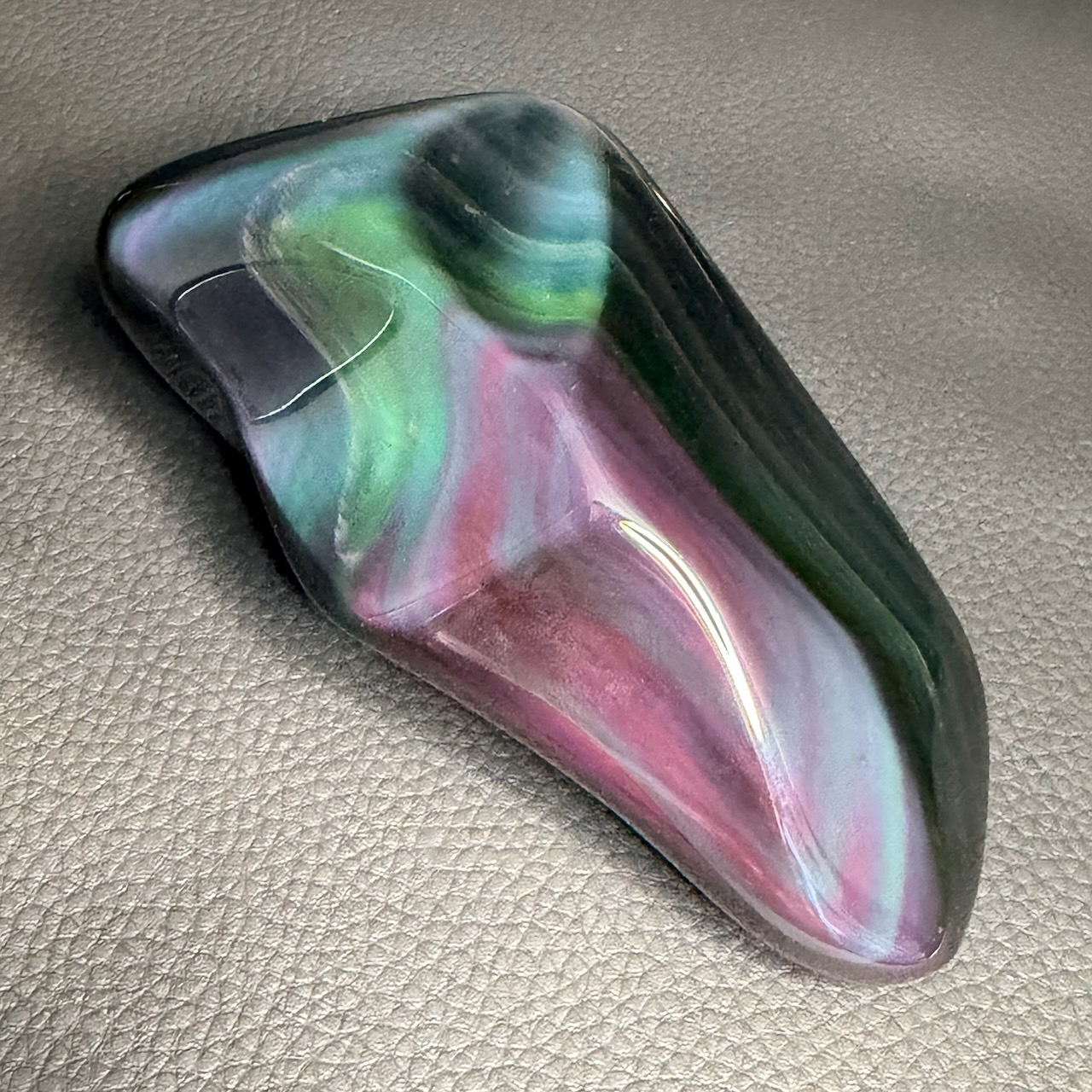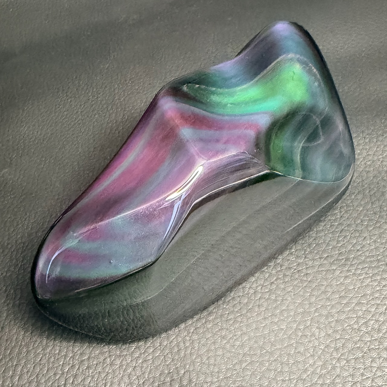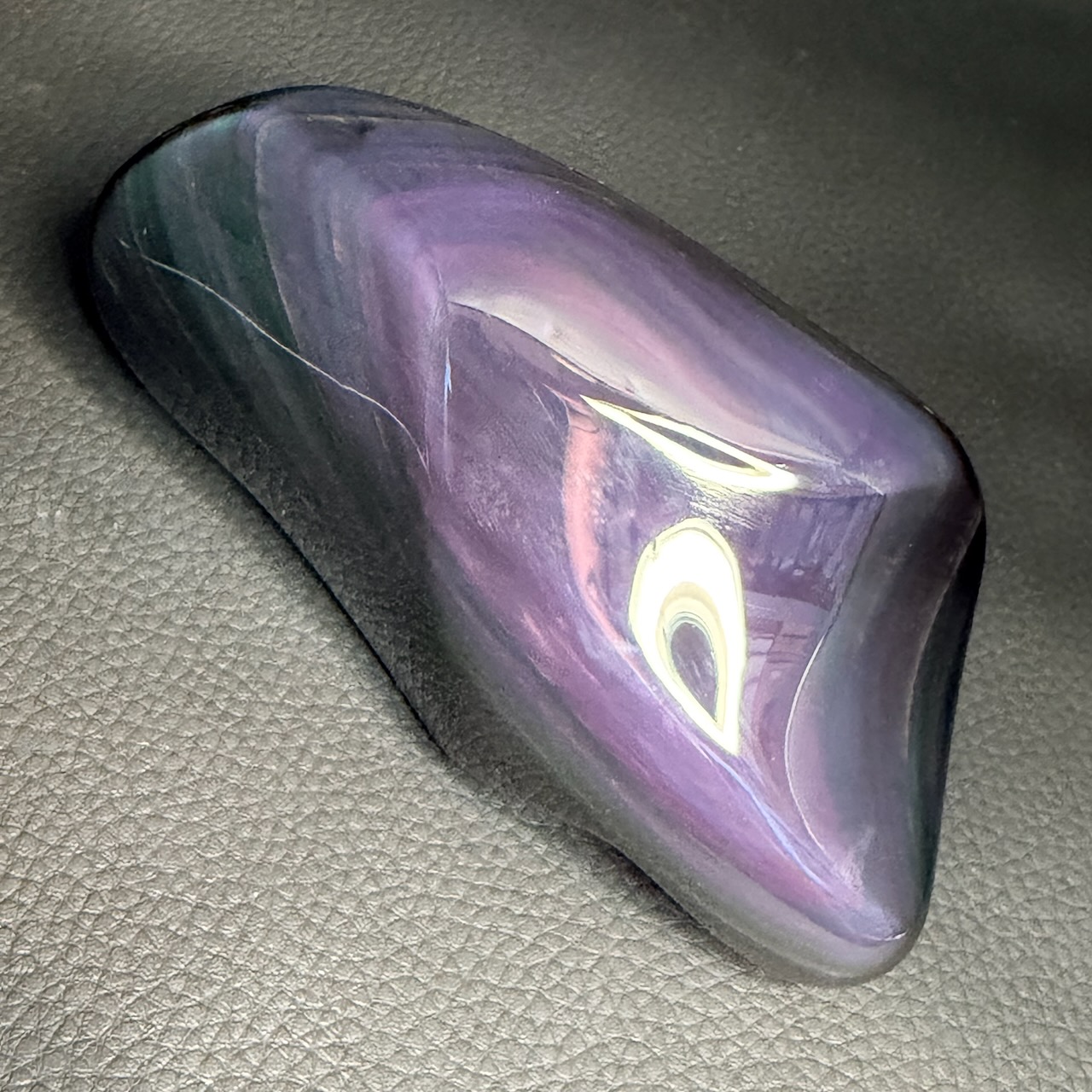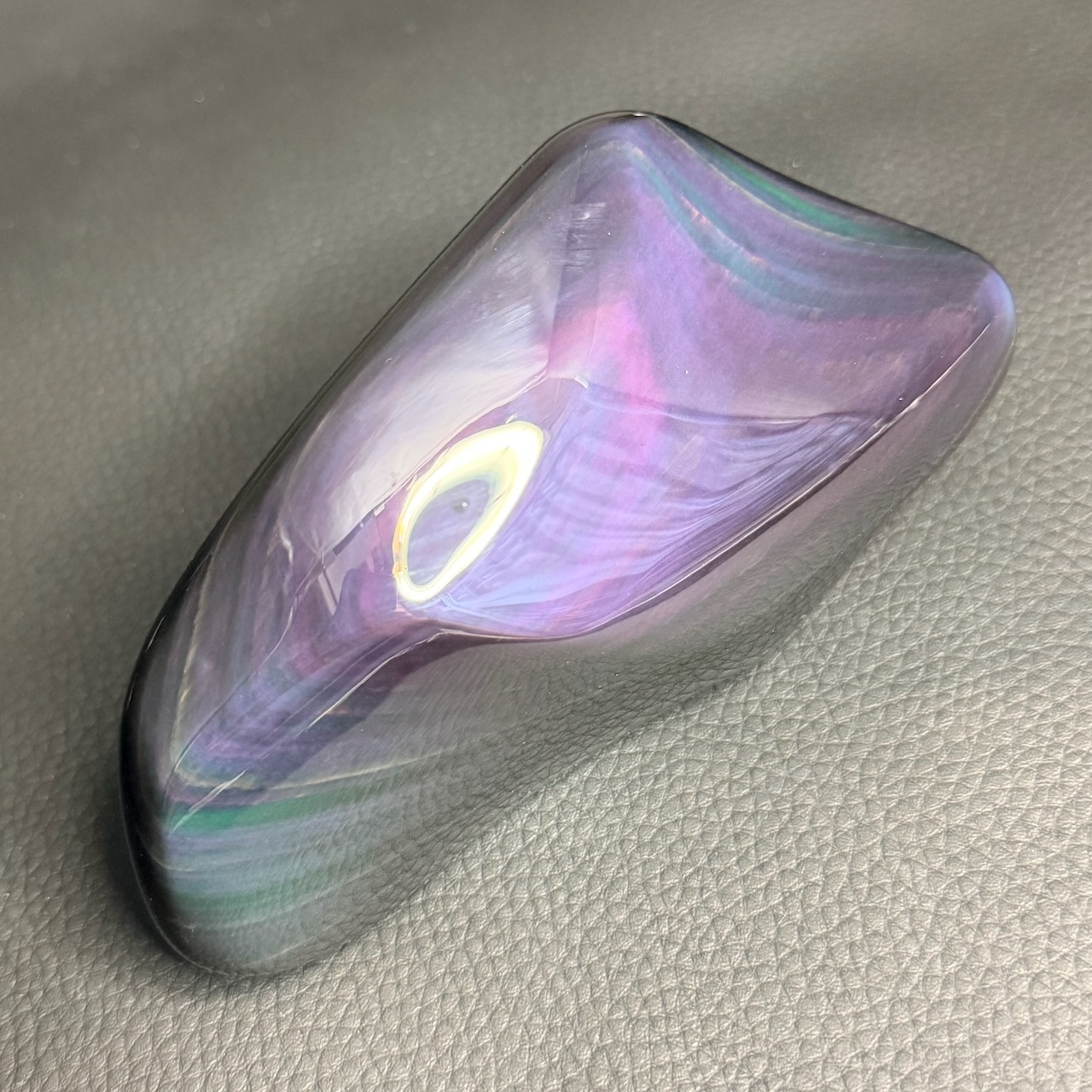 Les obsidiennes oeil céleste réfléchisses la lumière du soleil selon les angles, de manière que les reflets jaunes, verts, violets, bleus gris, dorés et argentés soit visible a l’ail nu, ce phénomène est appelé arc-en-ciel ou oeil céleste.