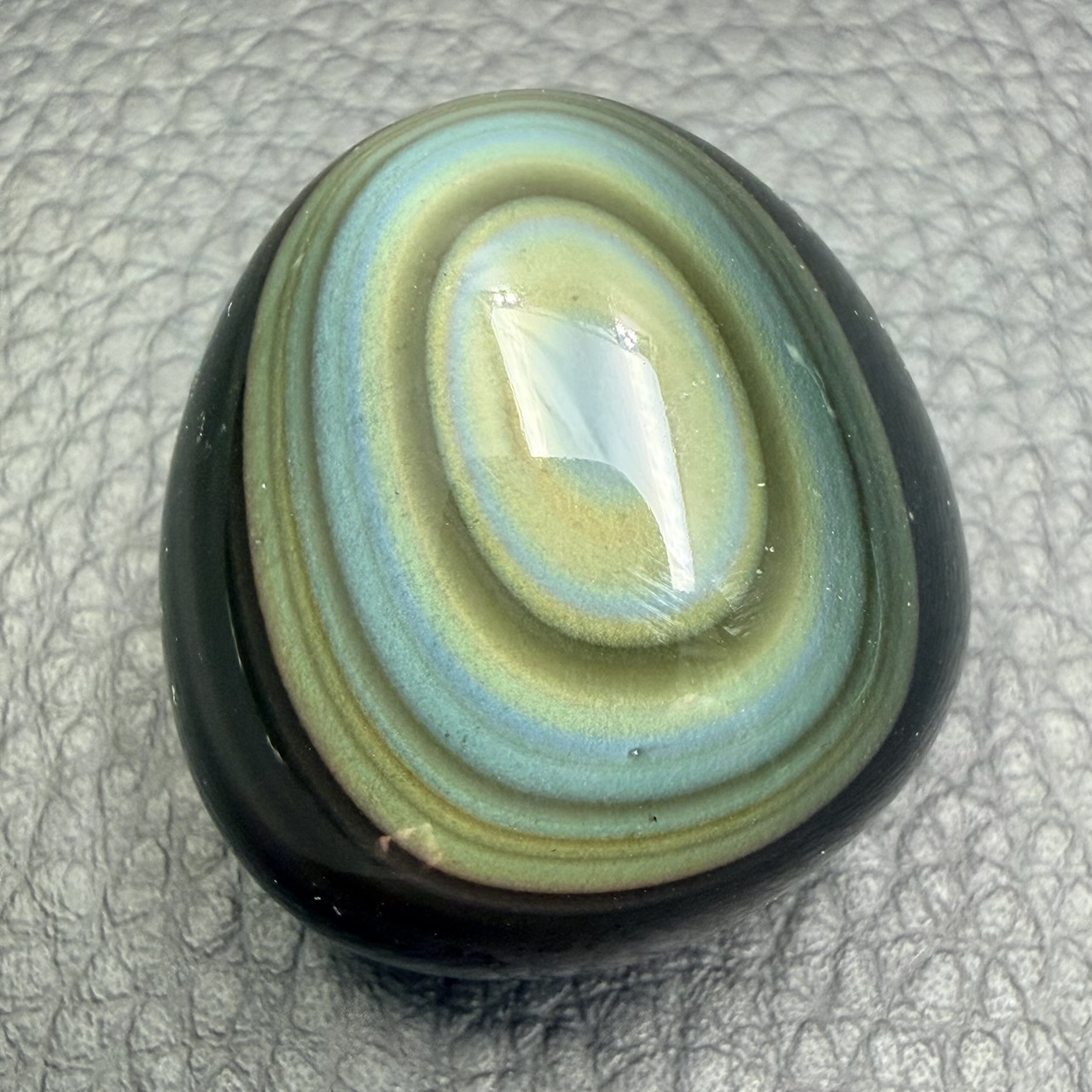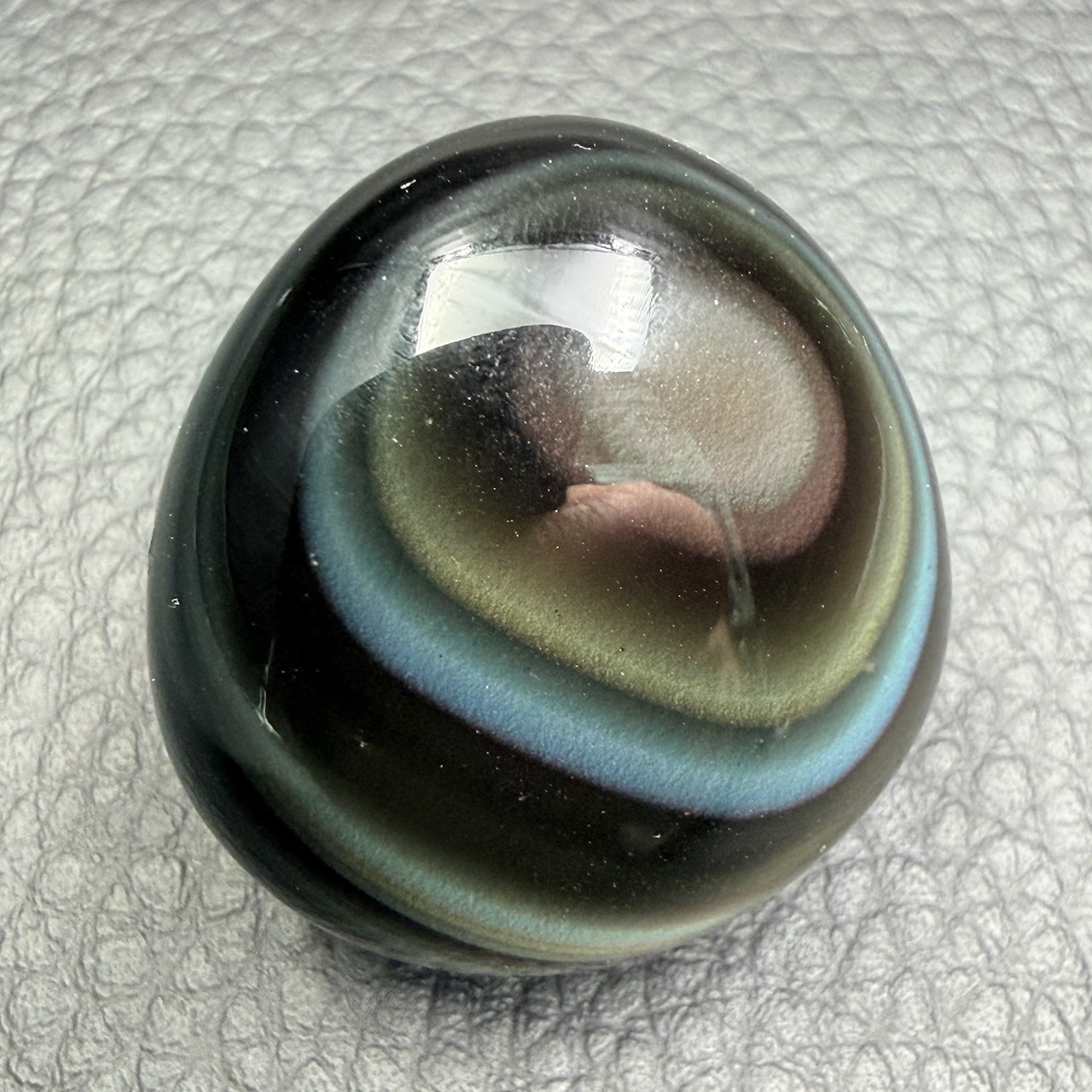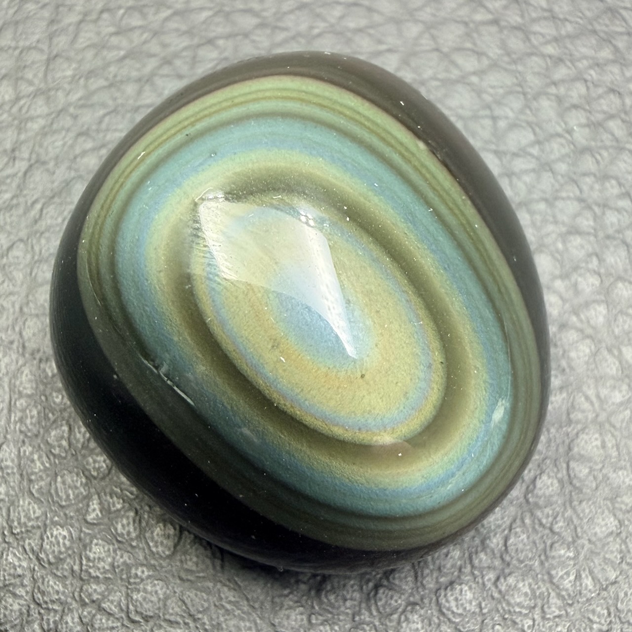 Les obsidiennes oeil céleste réfléchisses la lumière du soleil selon les angles, de manière que les reflets jaunes, verts, violets, bleus gris, dorés et argentés soit visible a l’ail nu, ce phénomène est appelé arc-en-ciel ou oeil céleste.
