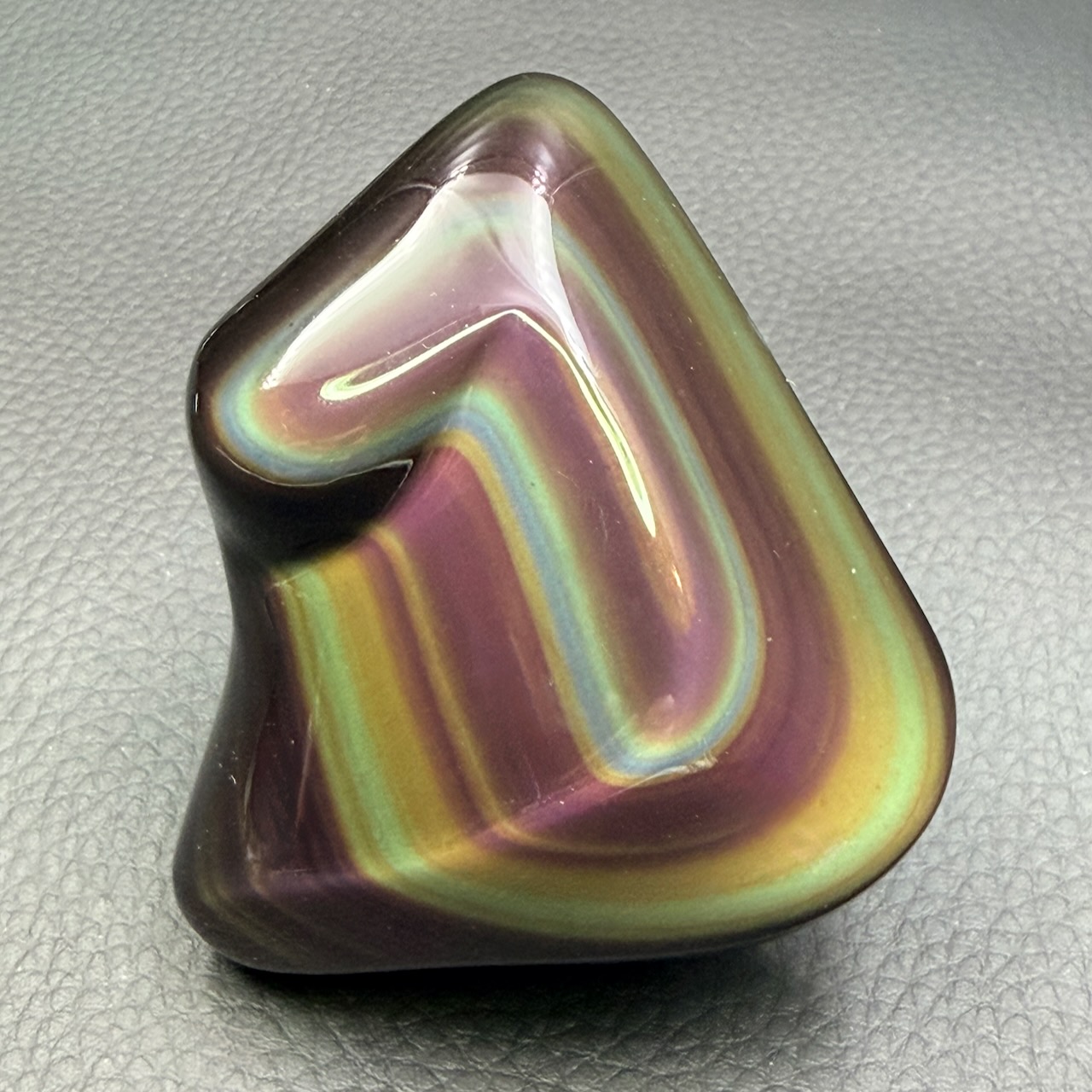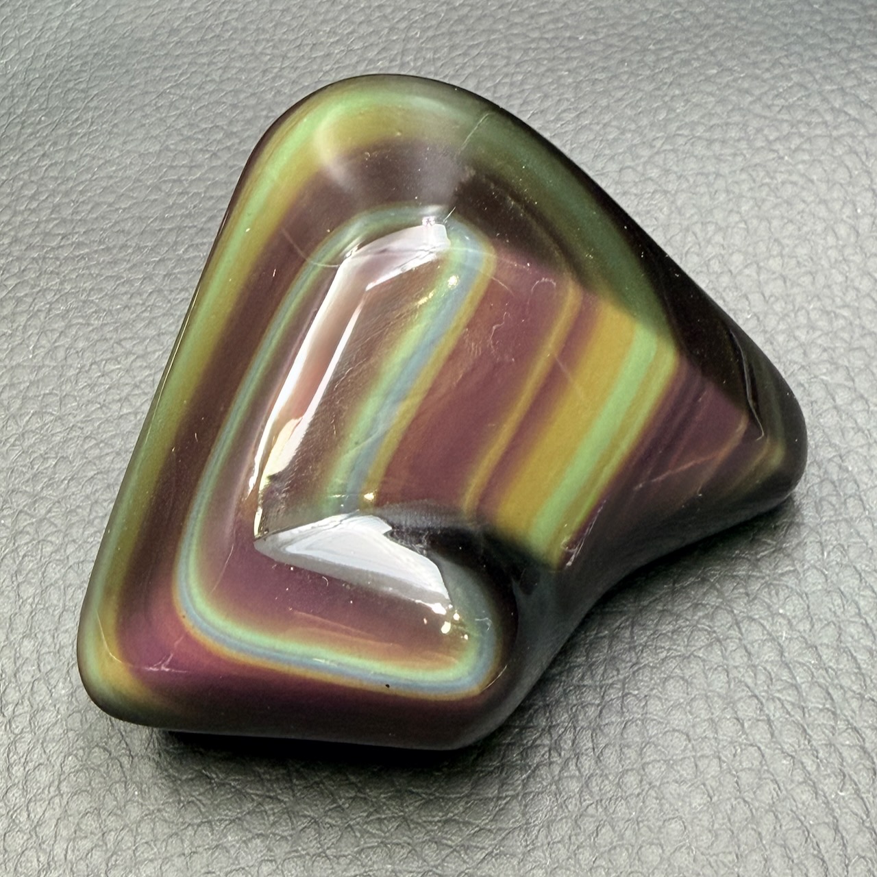 Les obsidiennes oeil céleste réfléchisses la lumière du soleil selon les angles, de manière que les reflets jaunes, verts, violets, bleus gris, dorés et argentés soit visible a l’ail nu, ce phénomène est appelé arc-en-ciel ou oeil céleste.