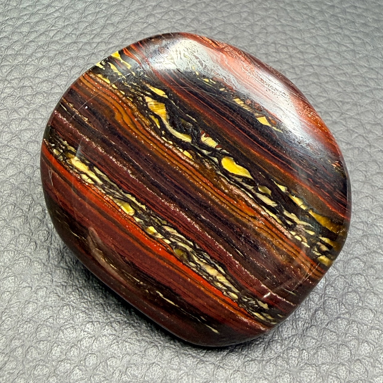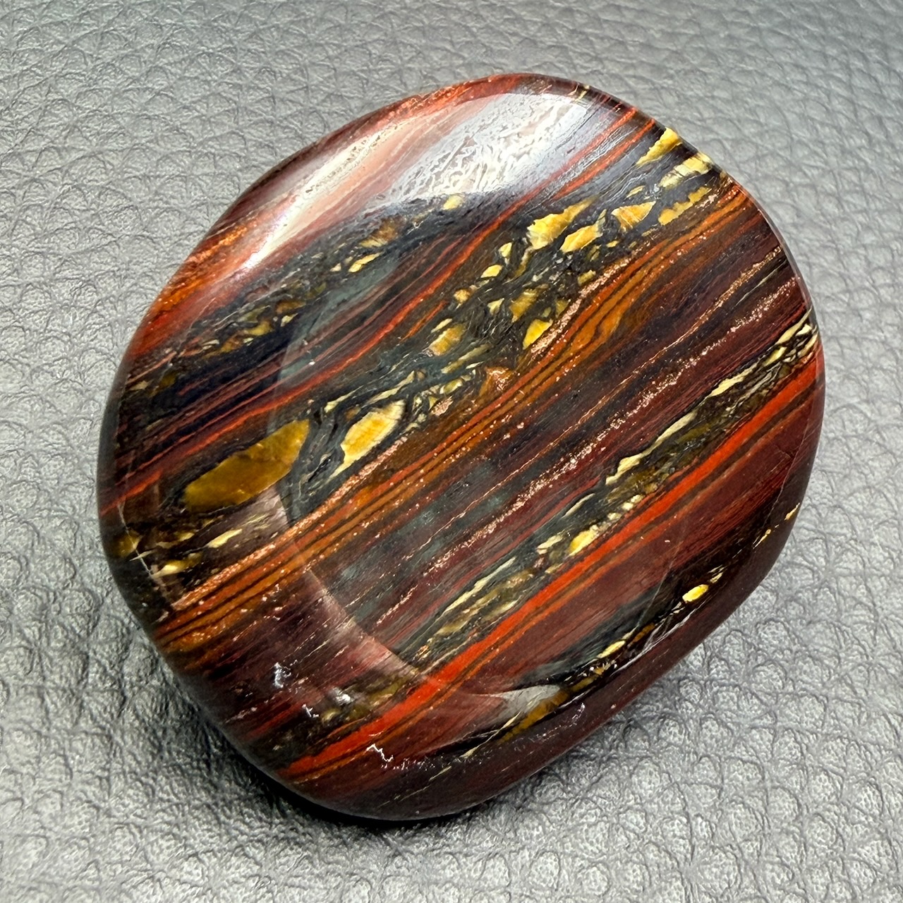 L’Oeil de Fer, appelé aussi jaspe hématoïde, est constitué d’Oeil de Tigre chatoyant (Quartz Fibreux), d’Oxyde de Fer (Hématite) et de Jaspe, tous disposés en couches harmonieuses et relativement parallèles, résultant d’inter-stratifications successives.