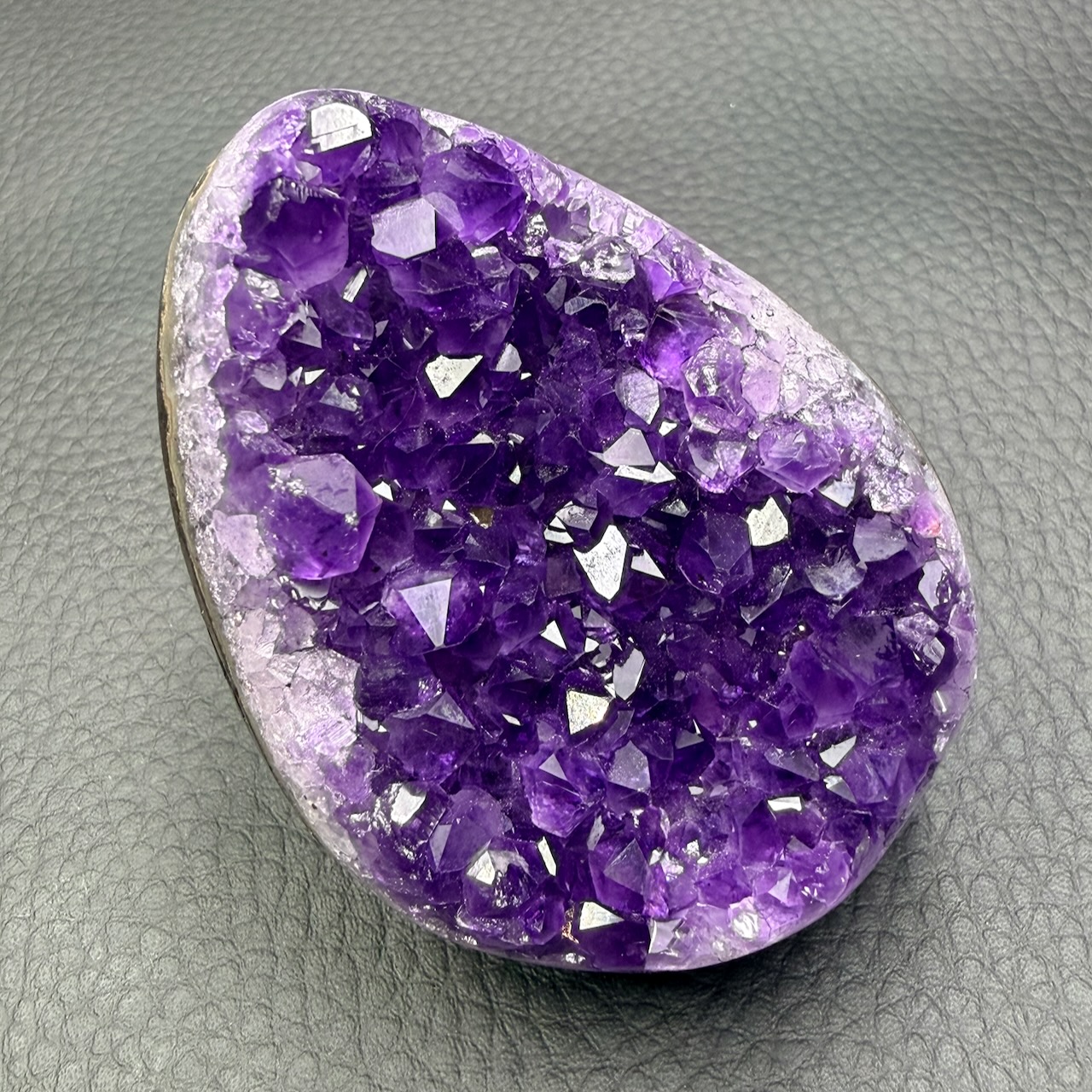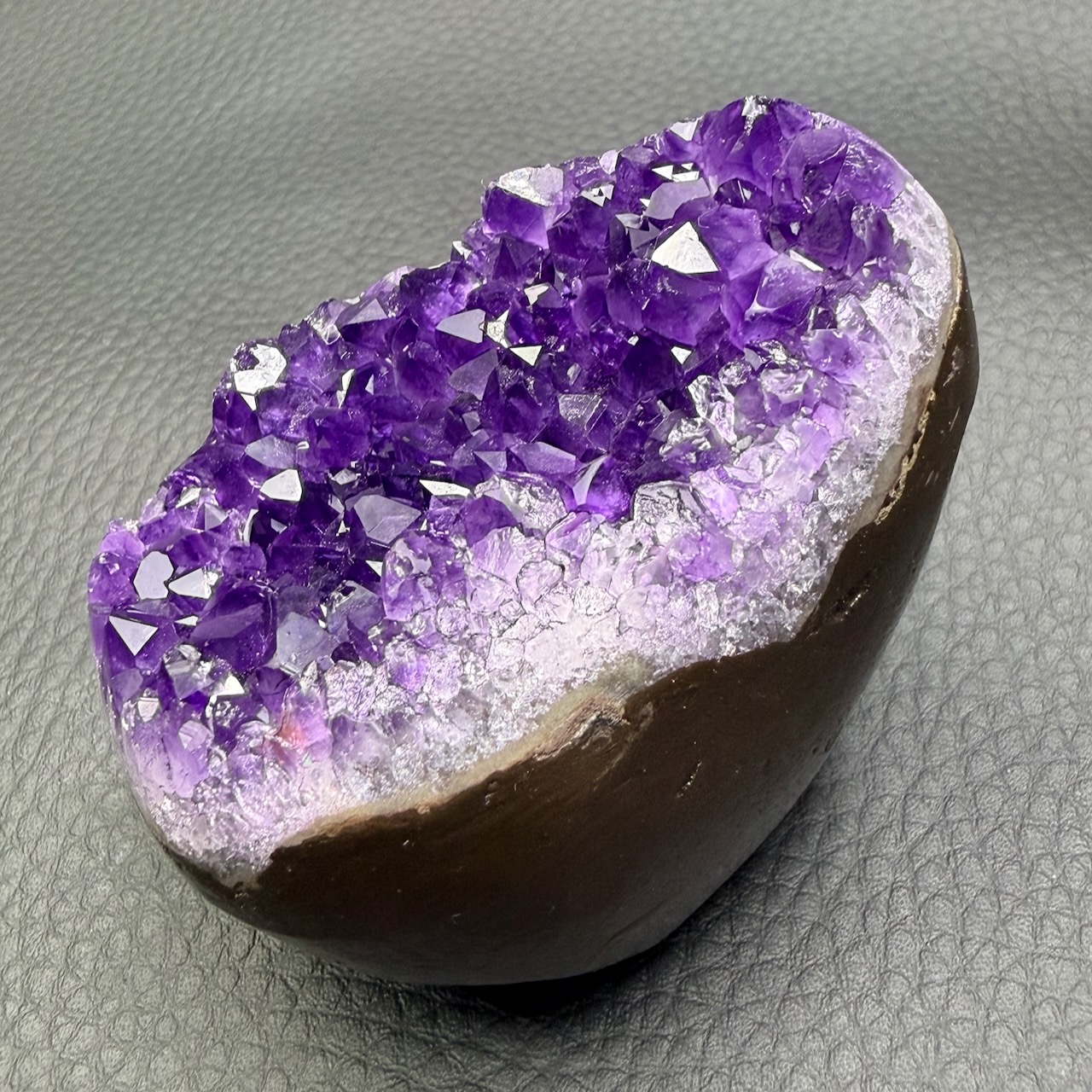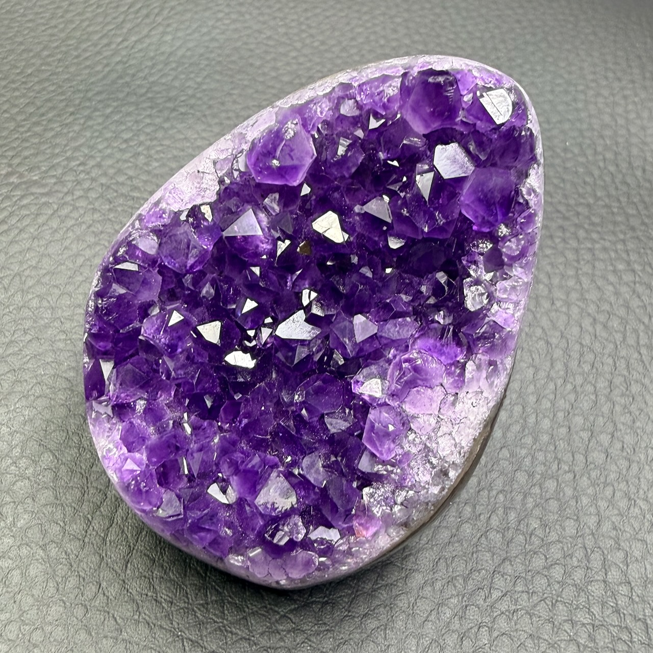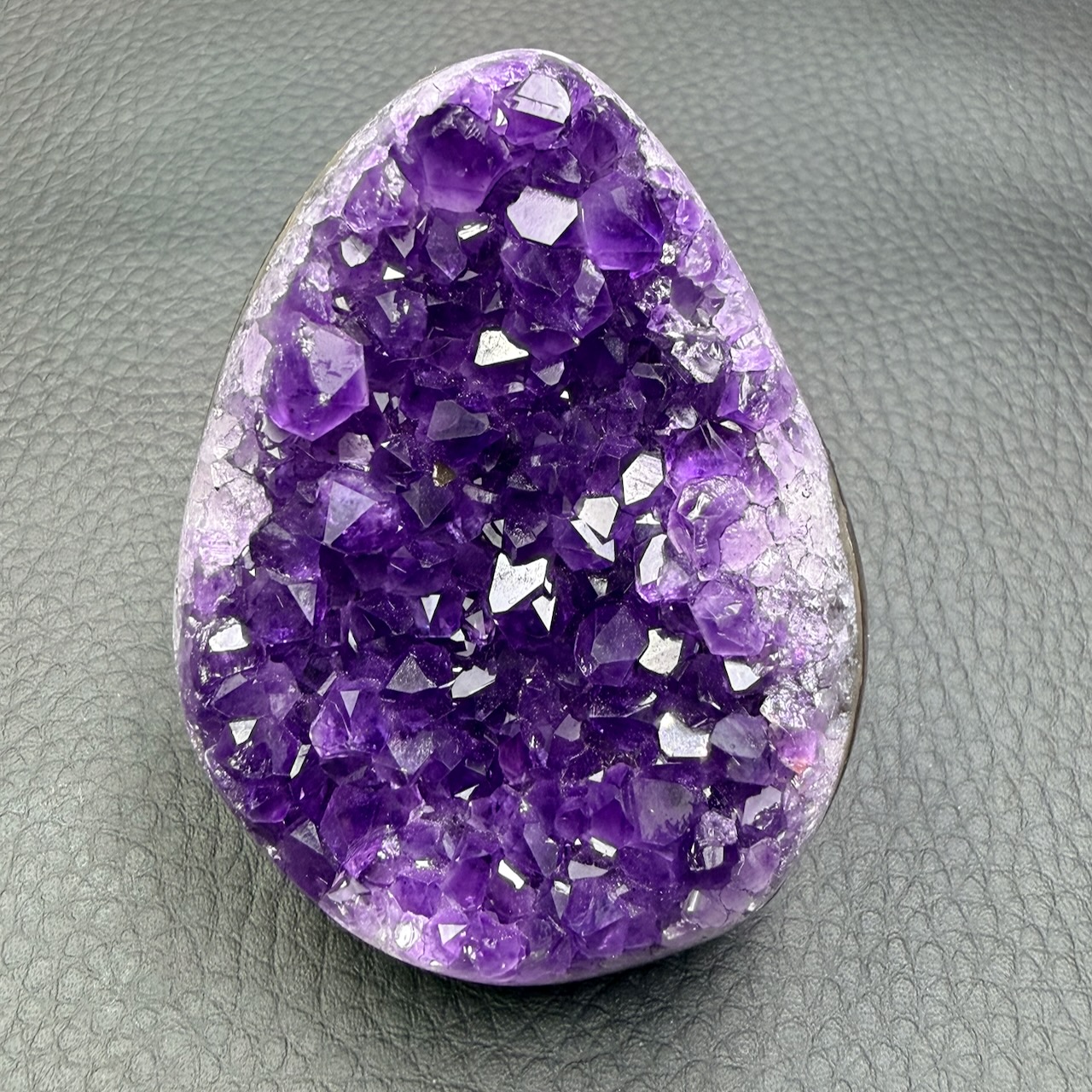Née du feu et du lent travail de la Terre, elle se présente ici sous une forme qui évoque la vie elle-même un œuf, symbole universel de création et de renaissance. Cet œuf en améthyste, mi-poli, mi-cristallisé, capture dans sa forme parfaite la dualité de la matière : la douceur du poli et la rigueur du cristal brut.