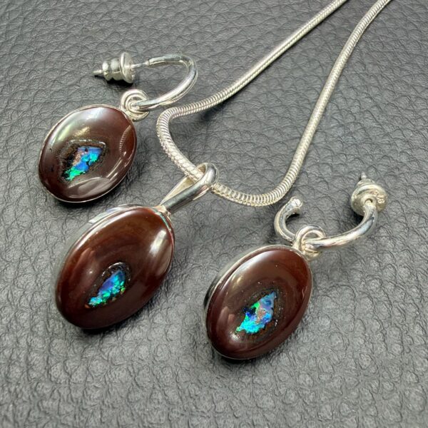 Ce qui rend cette parure en opale boulder véritablement exceptionnelle réside dans un détail fondamental : le pendentif et les boucles d’oreilles ont été taillés dans **la même noix d’opale**. Cette origine commune crée une harmonie visuelle et énergétique rare, presque impossible à reproduire.