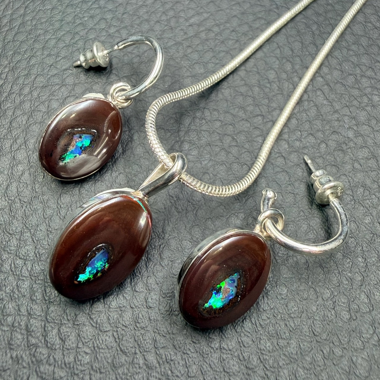 L’un des éléments les plus remarquables de cette parure en opale boulder est le fait que le pendentif et les boucles d’oreilles proviennent de **la même noix d’opale**. Cette précision n’est pas anodine. Elle signifie que les trois pièces partagent la même origine minérale, la même structure interne, les mêmes nuances chromatiques et la même vibration naturelle.