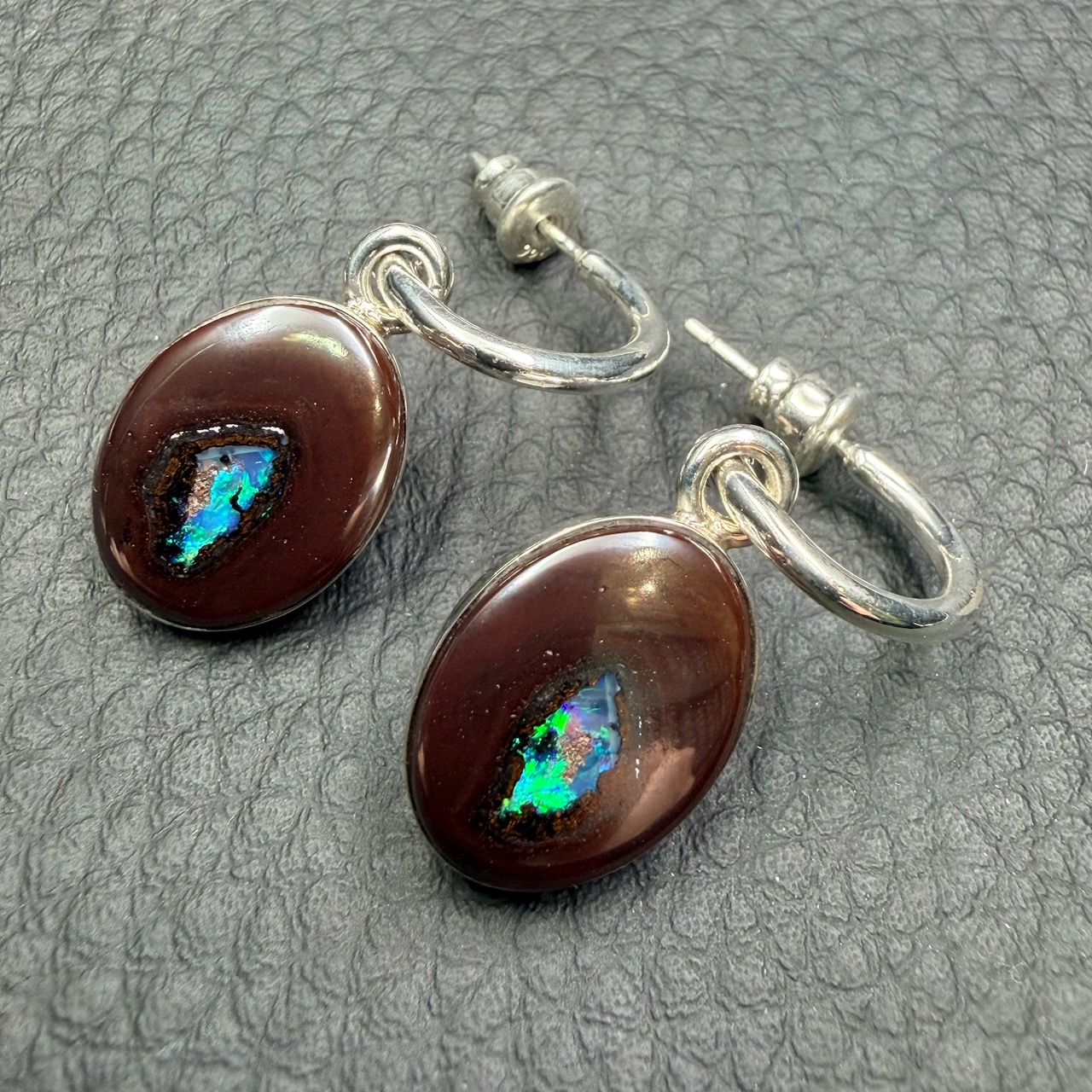 À chaque mouvement de tête, les boucles d’oreilles captent la lumière et la renvoient différemment, révélant des reflets changeants. Elles encadrent le visage avec douceur tout en affirmant une présence minérale forte, caractéristique de l’opale boulder.