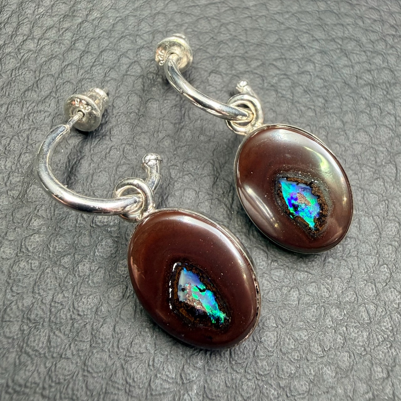 Les boucles d’oreilles en opale boulder complètent la parure avec une élégance naturelle. Issues de la même noix d’opale que le pendentif, elles offrent une symétrie subtile sans jamais être parfaitement identiques. Cette légère variation, propre à la pierre naturelle, renforce l’authenticité de la parure.