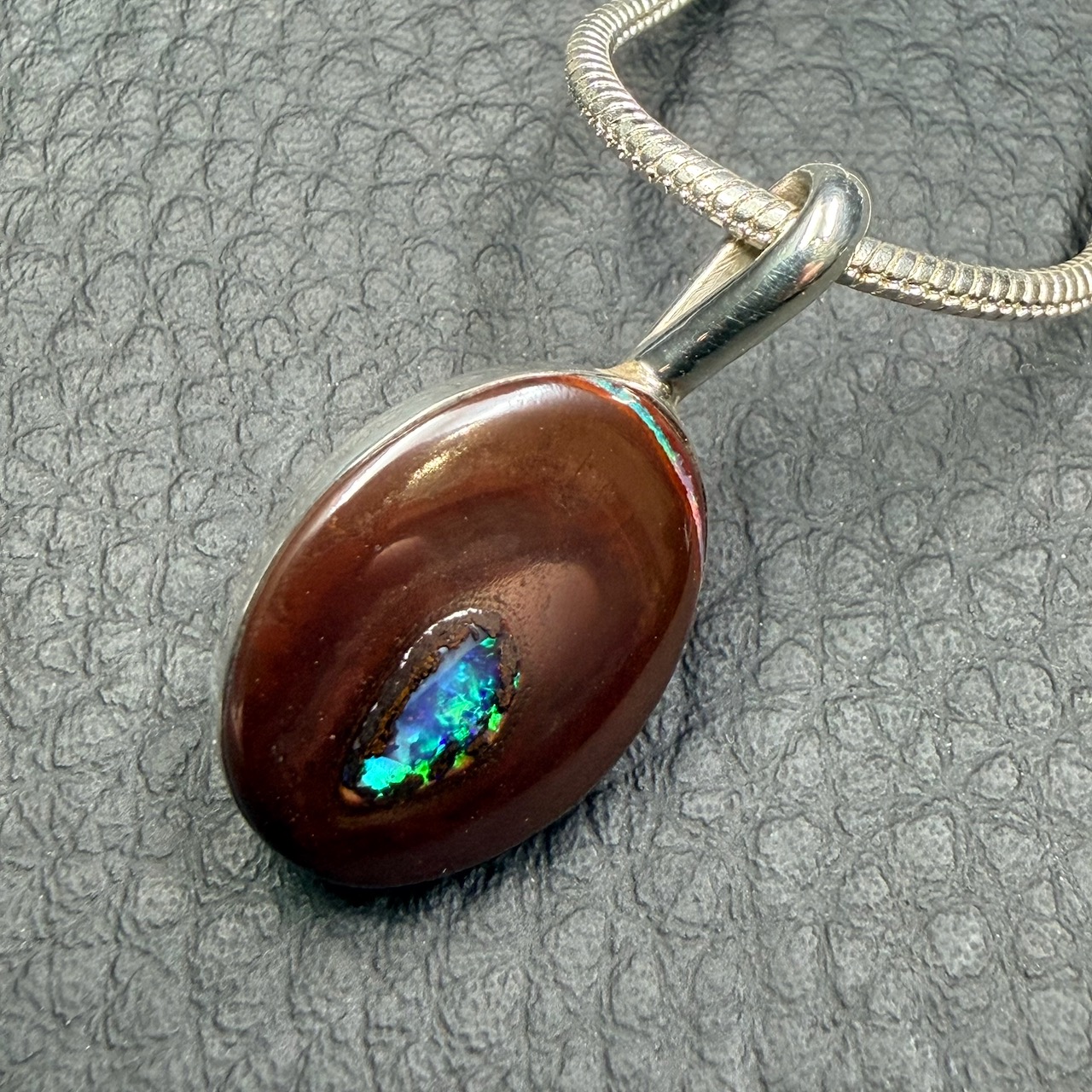 Le pendentif en opale boulder est la pièce maîtresse de cette parure. Suspendu à une chaîne en argent, il attire immédiatement le regard par la profondeur de ses couleurs et par la singularité de ses motifs naturels. La présence de la roche mère accentue le contraste et donne à la pierre une intensité presque picturale, comme un paysage minéral figé dans le temps.