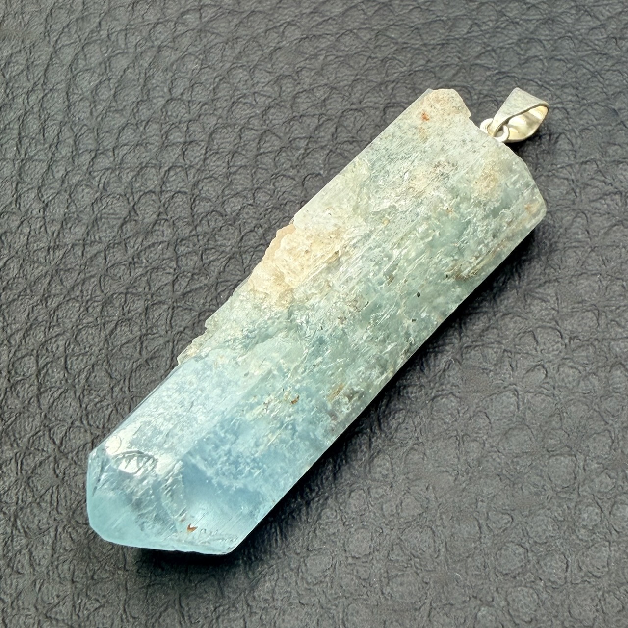 Taille du pendentif aigue marine Hors bélière 4,4 cm sur 1,4 cm sur 1,1 cm.