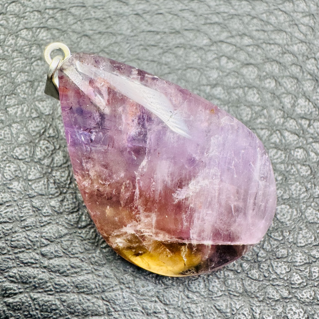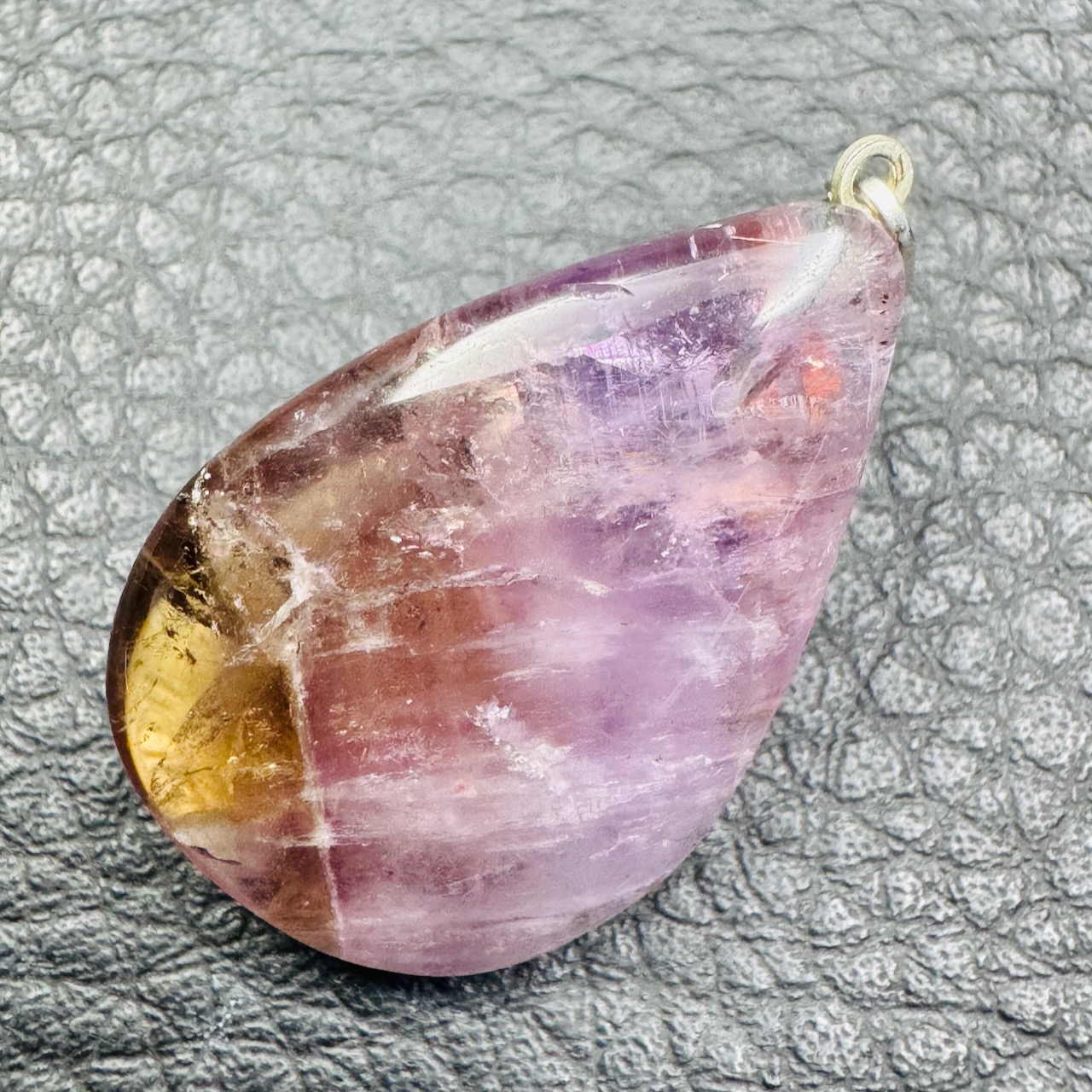 La goethite, un minéral primaire formé d’oxyde de fer, se distingue par ses cristaux rares et striés, généralement dorés. Dans le Pendentif Super Seven, elle apparaît sous forme de fines inclusions qui, lorsqu’elles sont bien formées, prennent l’apparence de petits pompons dorés enchâssés dans la masse violette du quartz.