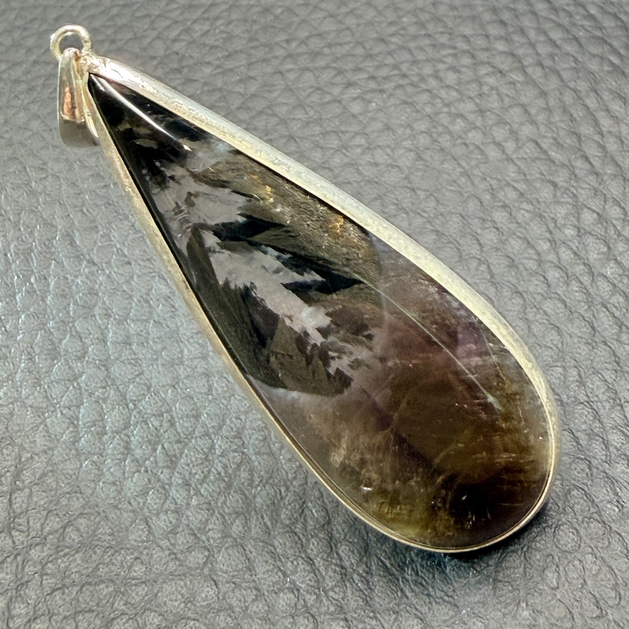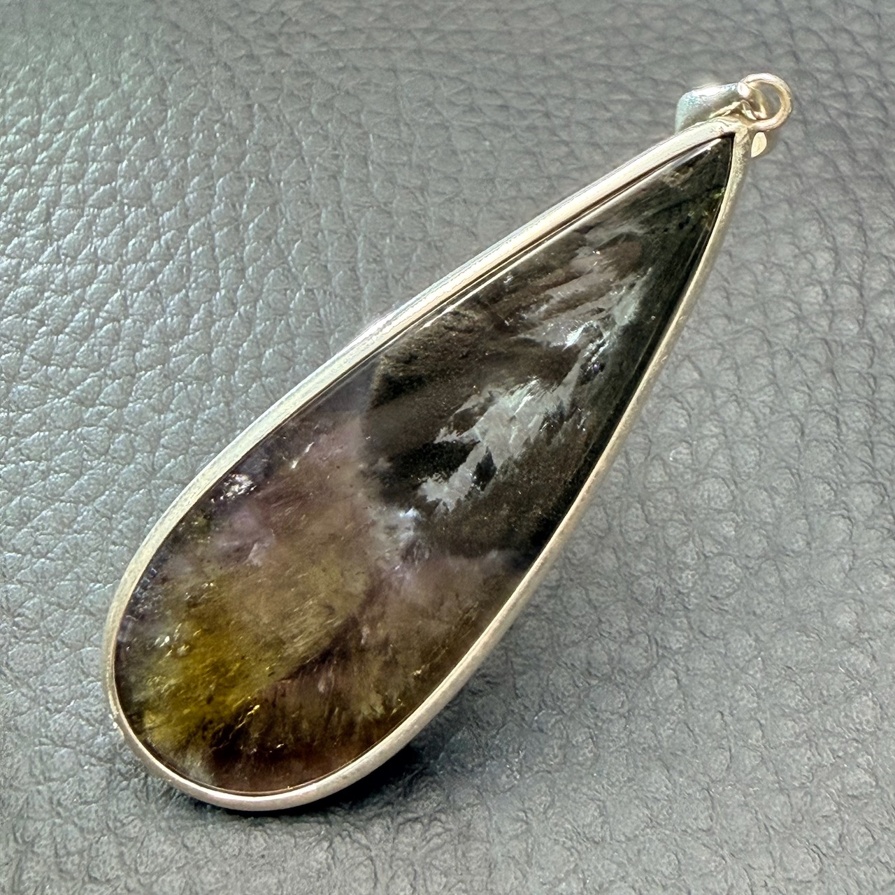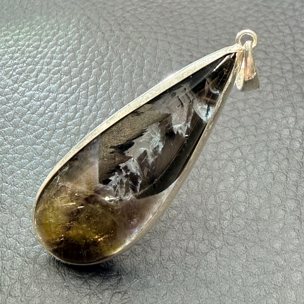 La goethite, un minéral primaire formé d’oxyde de fer, se distingue par ses cristaux rares et striés, généralement dorés. Dans le Pendentif Super Seven, elle apparaît sous forme de fines inclusions qui, lorsqu’elles sont bien formées, prennent l’apparence de petits pompons dorés enchâssés dans la masse violette du quartz.