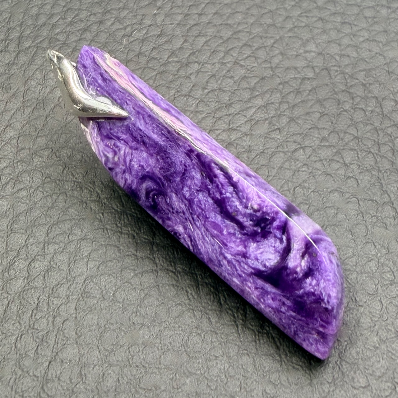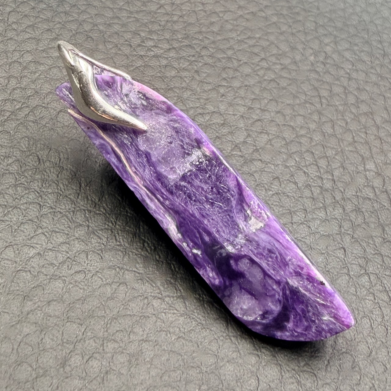 Taille du pendentif charoïte hors bélière 5,1 cm sur 1,3 cm sur 0,6 cm.