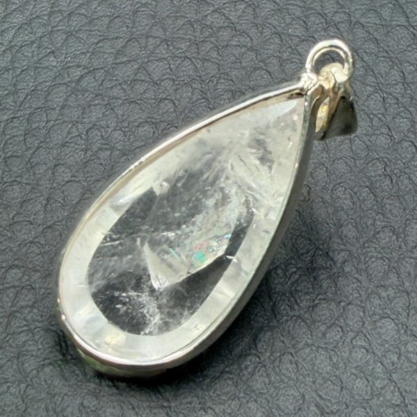 Dimensions du Pendentif Cristal de Roche avec Prisme Négatif hors bélière 3,2 cm sur 1,5 cm sur 0,7 cm.