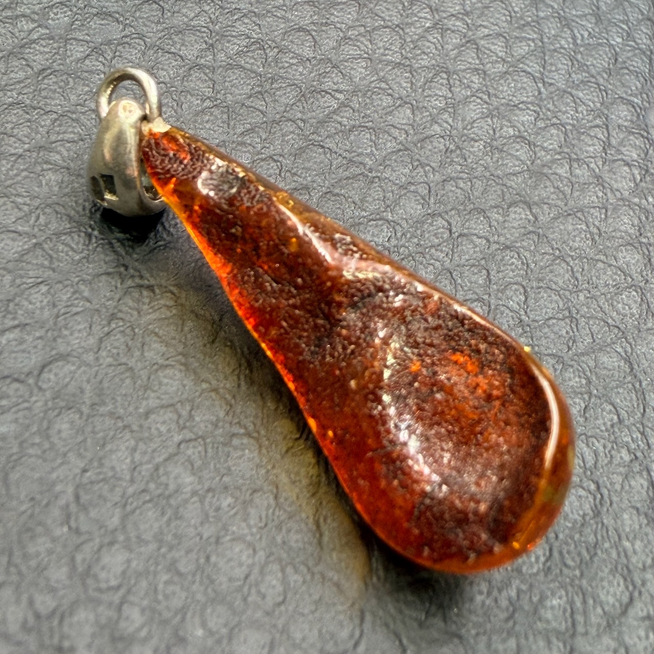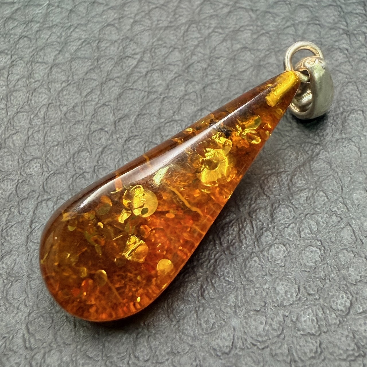 Taille du pendentif en ambre hors bélière: 3 cm sur 1,1 cm sur 0,5 cm.