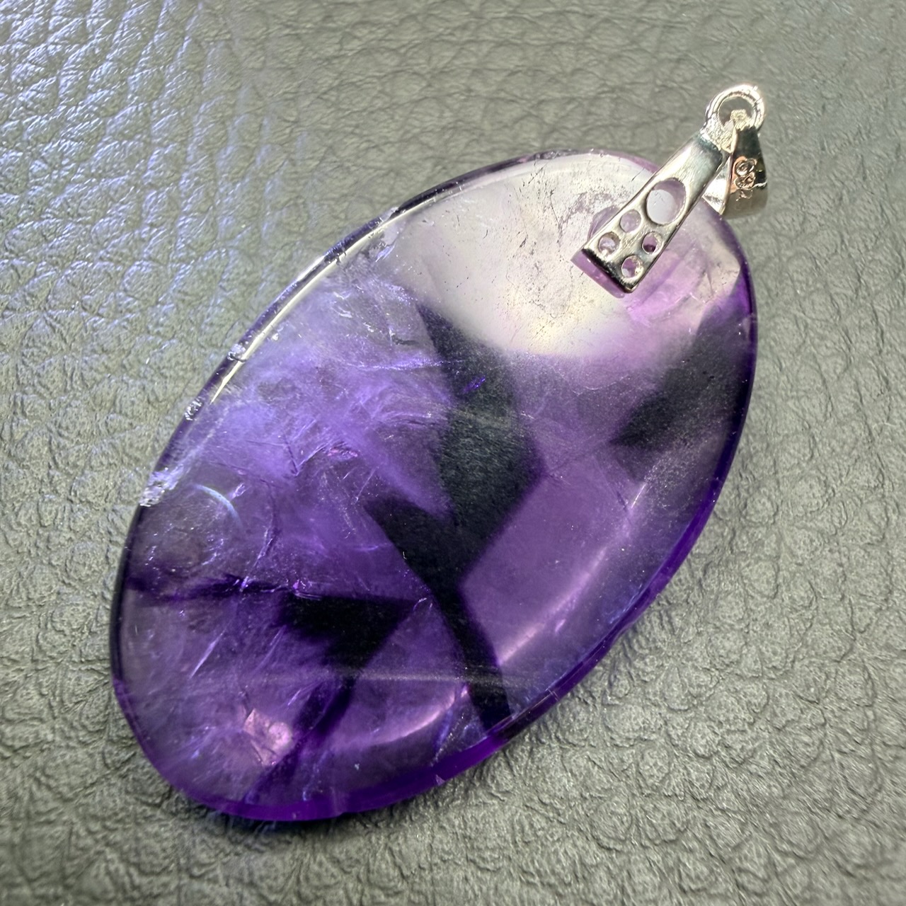 Taille du pendentif en améthyste trapiche hors bélière 3,7 cm sur 2,4 cm sur 0,5 cm.
