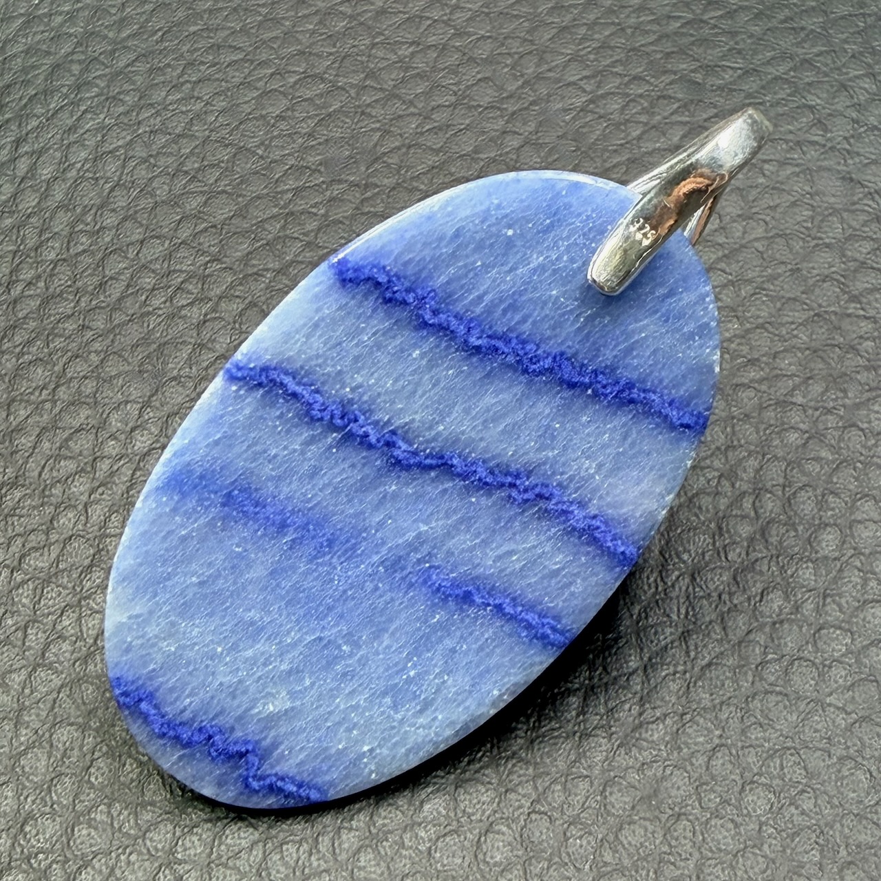 Taille du pendentif en aventurine bleue hors bélière 4,6 cm sur 2,7 cm sur 0,8 cm.