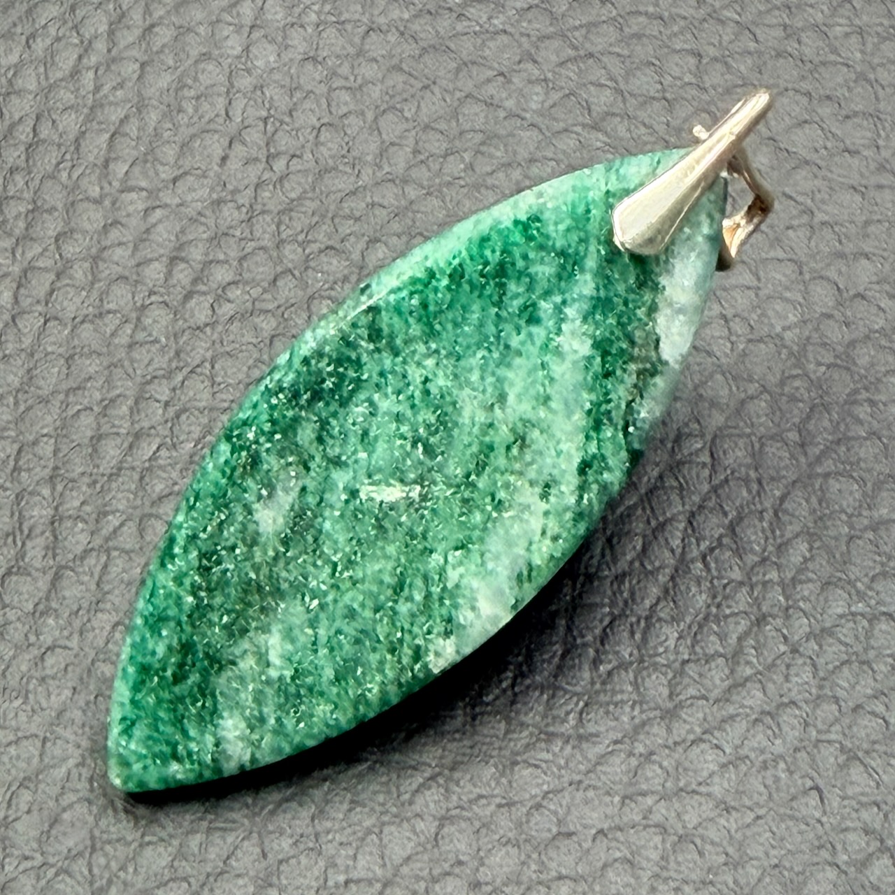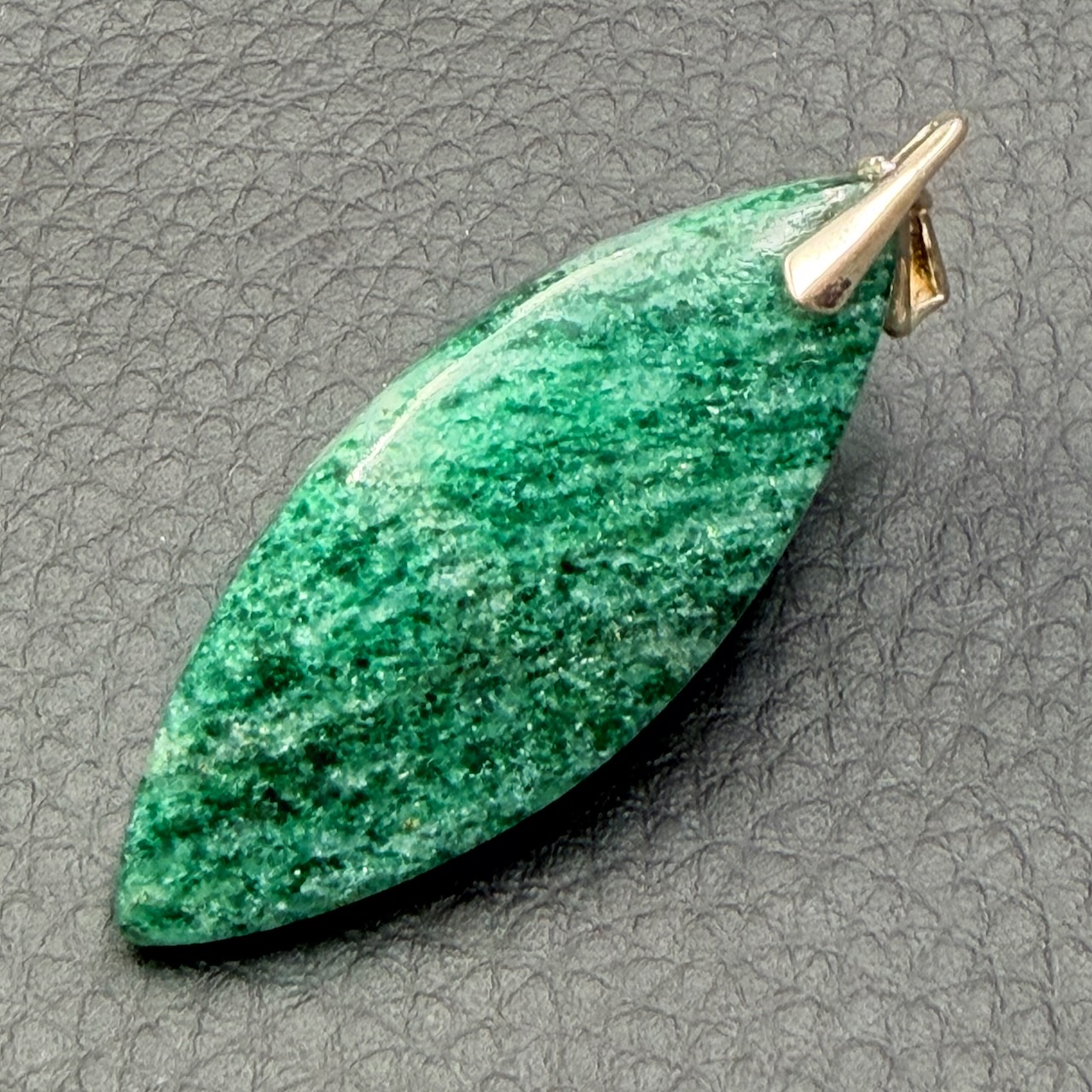 Taille du pendentif en aventurine verte hors bélière 4,9 cm sur 1,9 cm sur 0,6 cm.