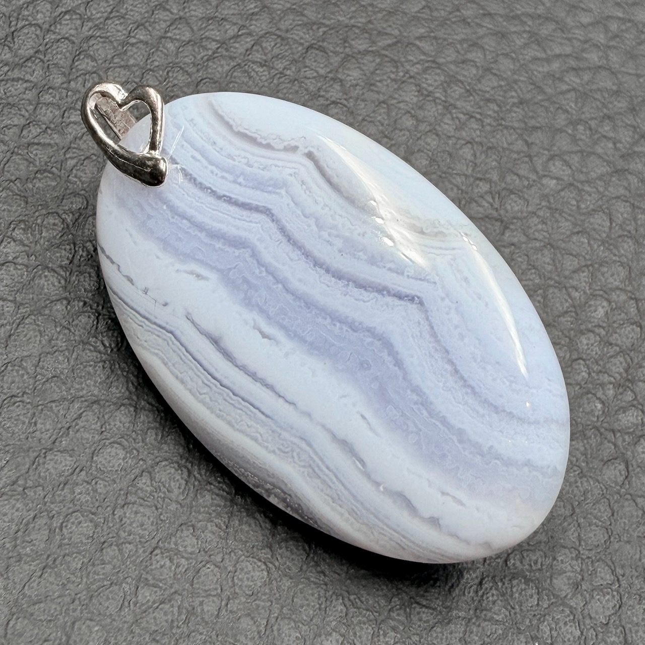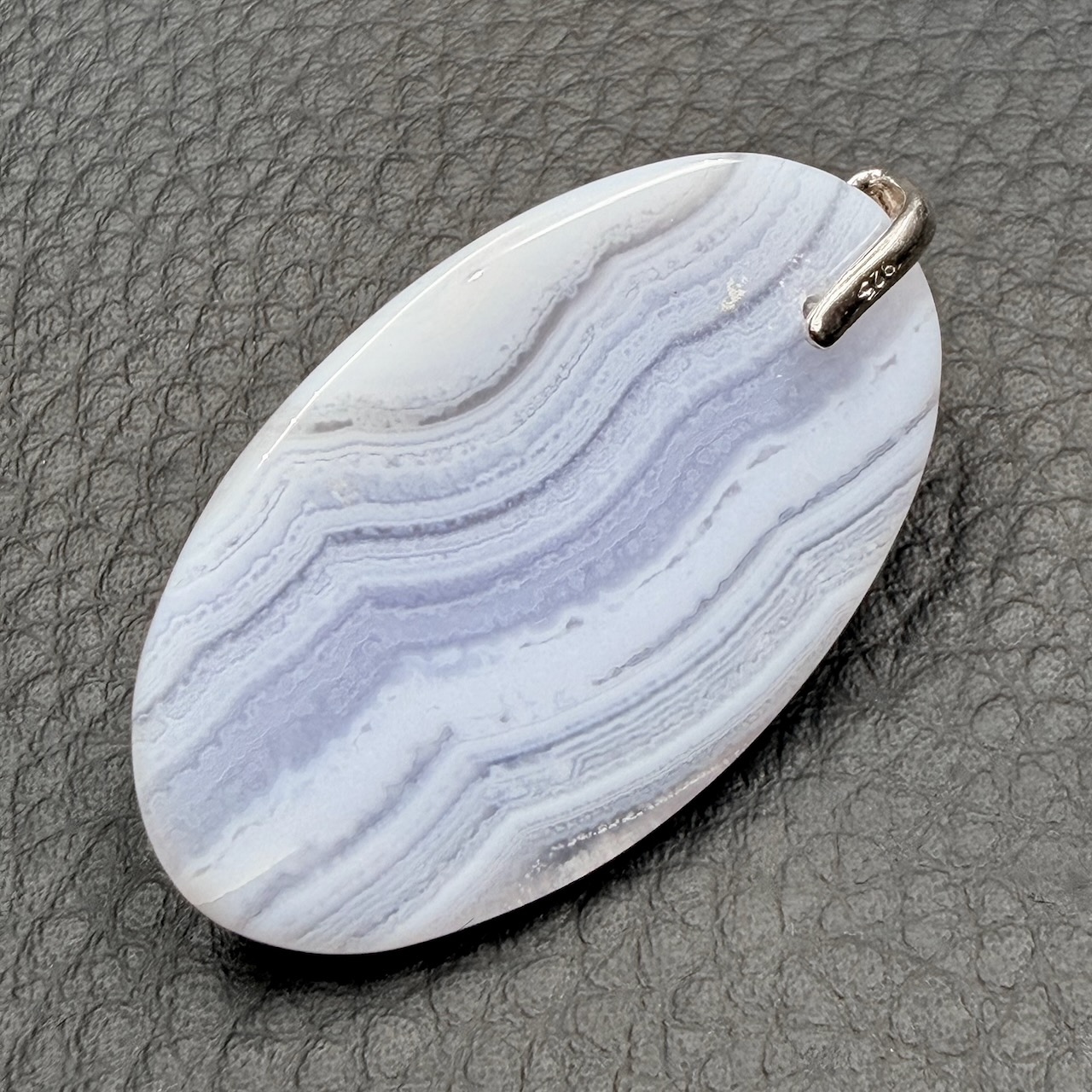 Taille du pendentif en calcédoine hors bélière 3,8 cm sur 2,3 cm sur 0,5 cm.