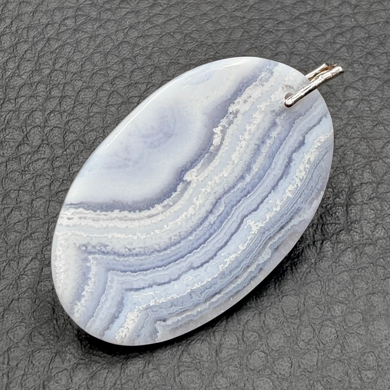 Taille du pendentif en calcédoine hors bélière 3,6 cm sur 2,4 cm sur 0,6 cm.