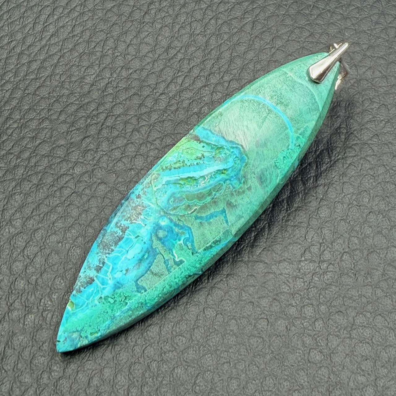 Taille du pendentif en chrysocolle hors bélière 6,2 cm sur 1,8 cm sur 0,5 cm.