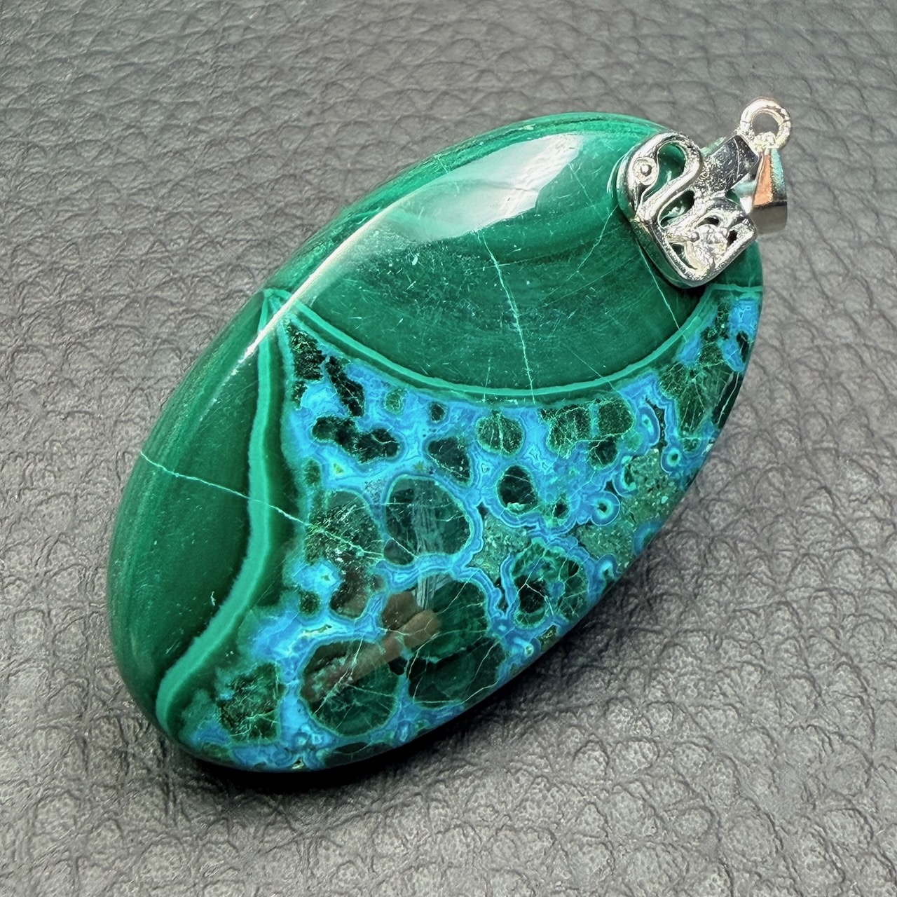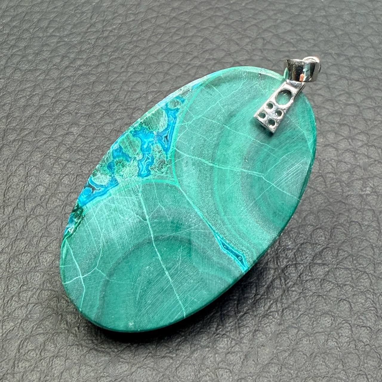 Taille du pendentif en chrysocolle et malachite hors bélière 4,1 cm sur 2,4 cm sur 0,7 cm.