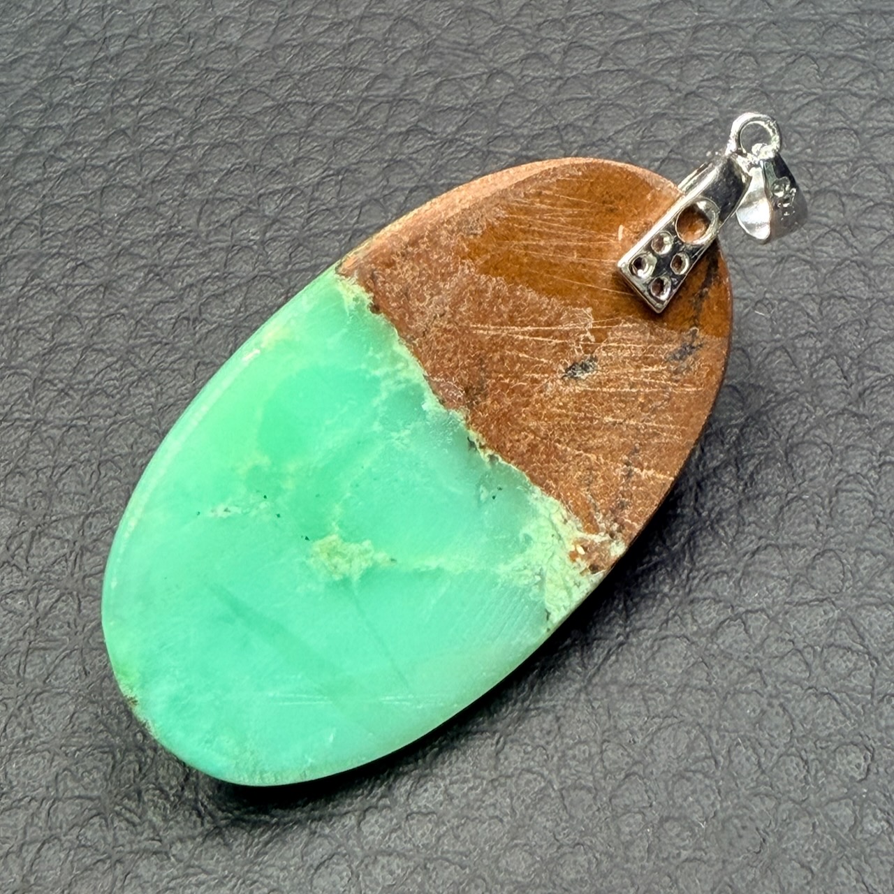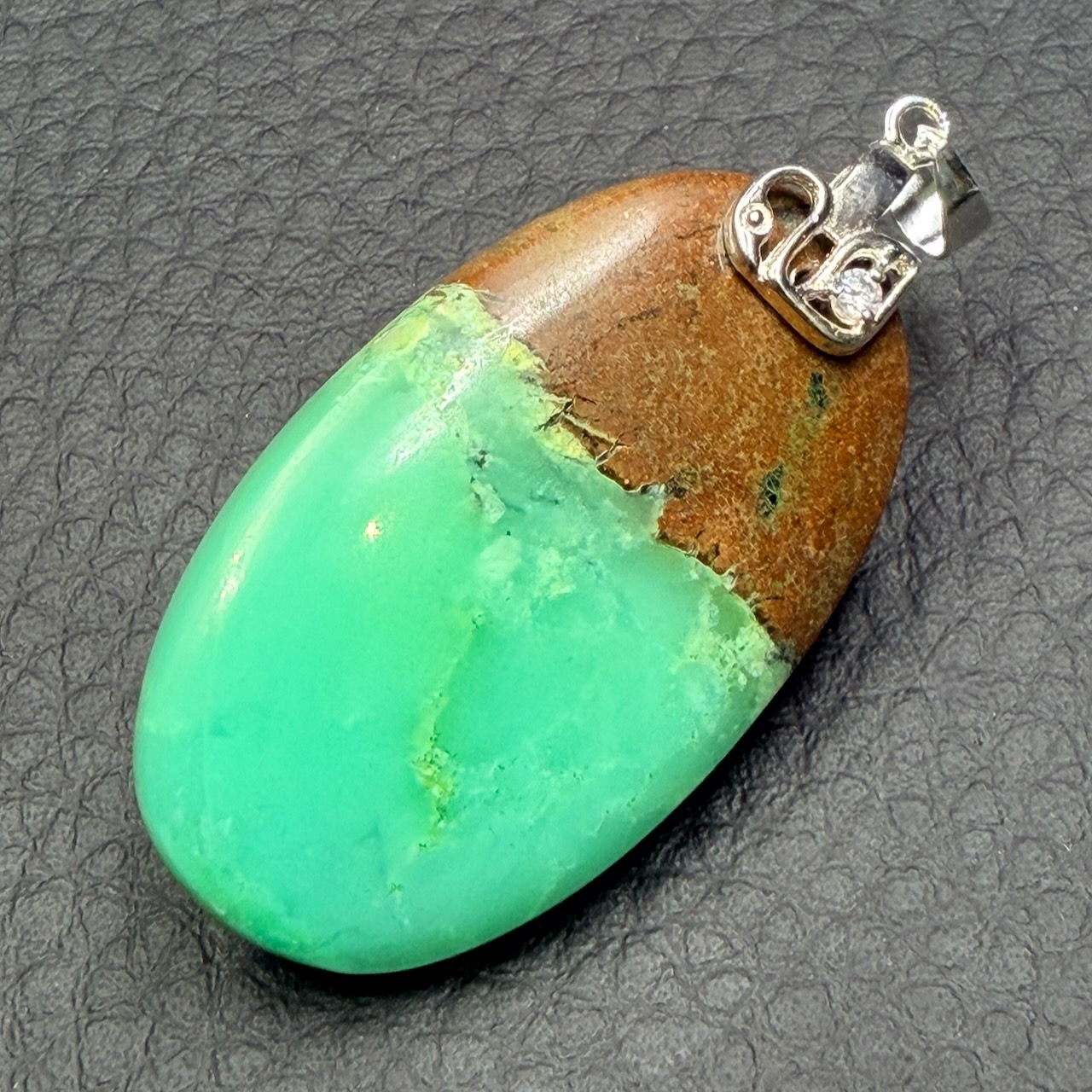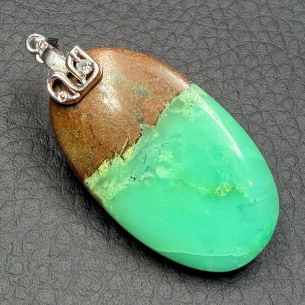 Taille du pendentif en chrysoprase hors bélière 3,7 cm sur 2,1 cm sur 0,5 cm.