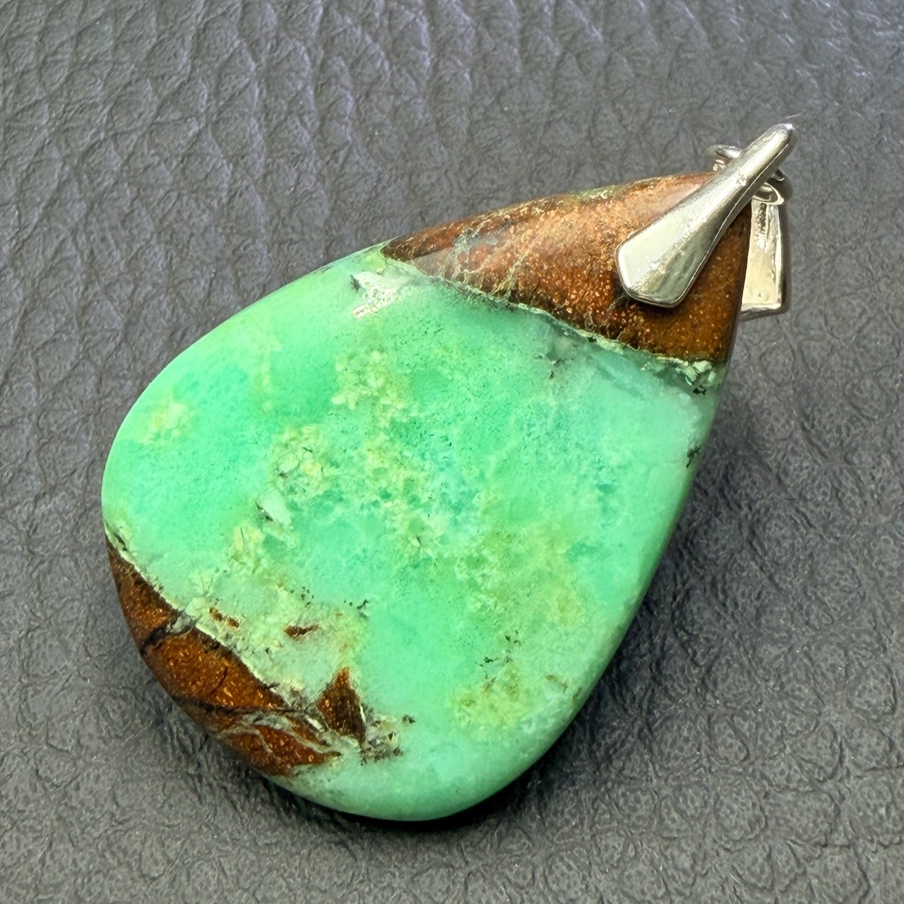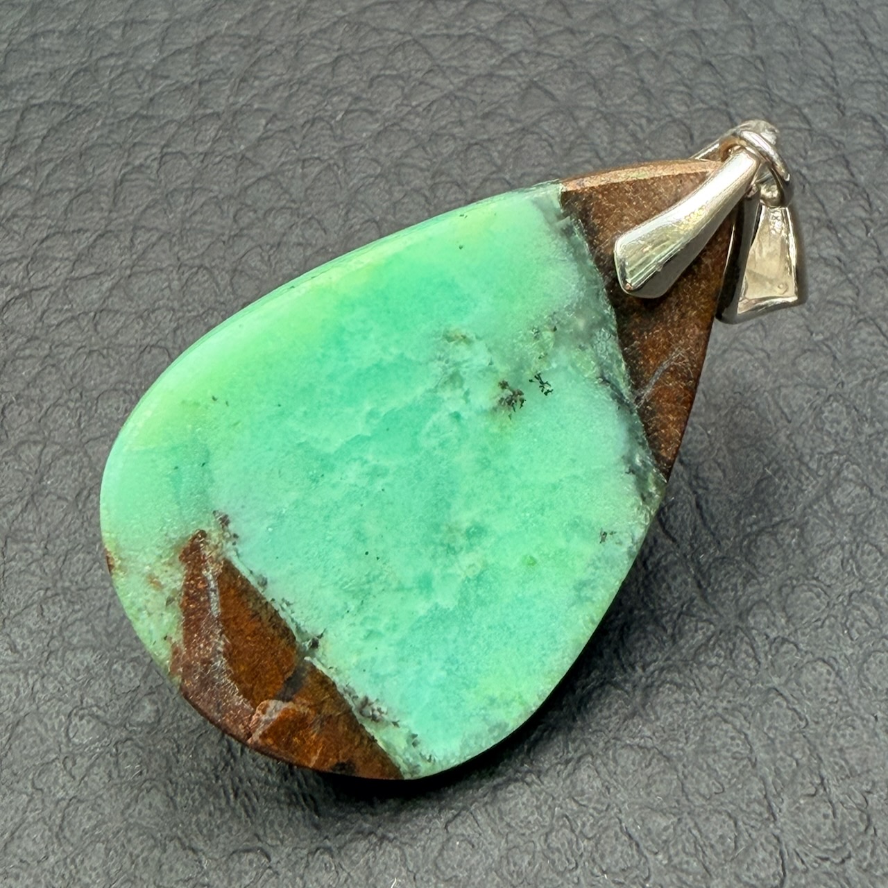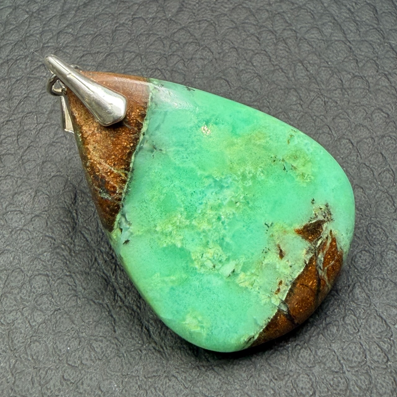 Taille du pendentif en Chrysoprase hors bélière 3,3 cm sur 2,2 cm sur 0,4 cm.
