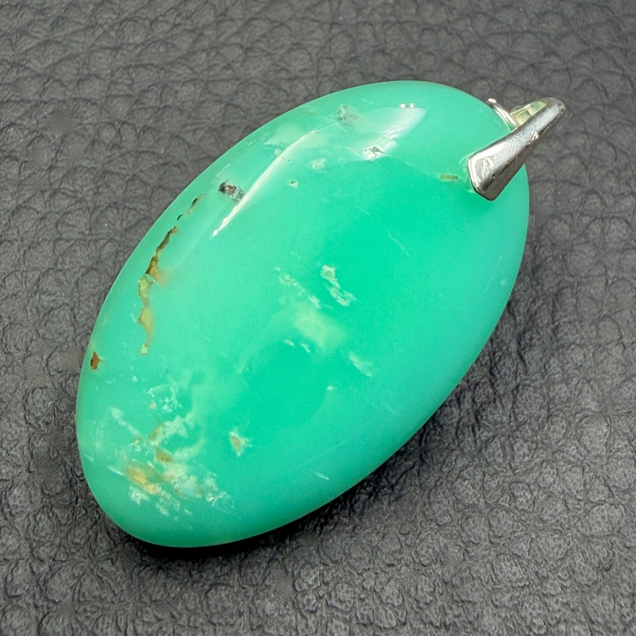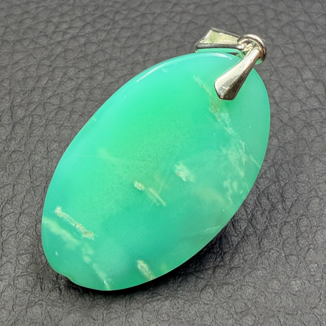 Taille du pendentif en chrysoprase hors bélière 4,6 cm sur 2,2 cm sur 0,7 cm.