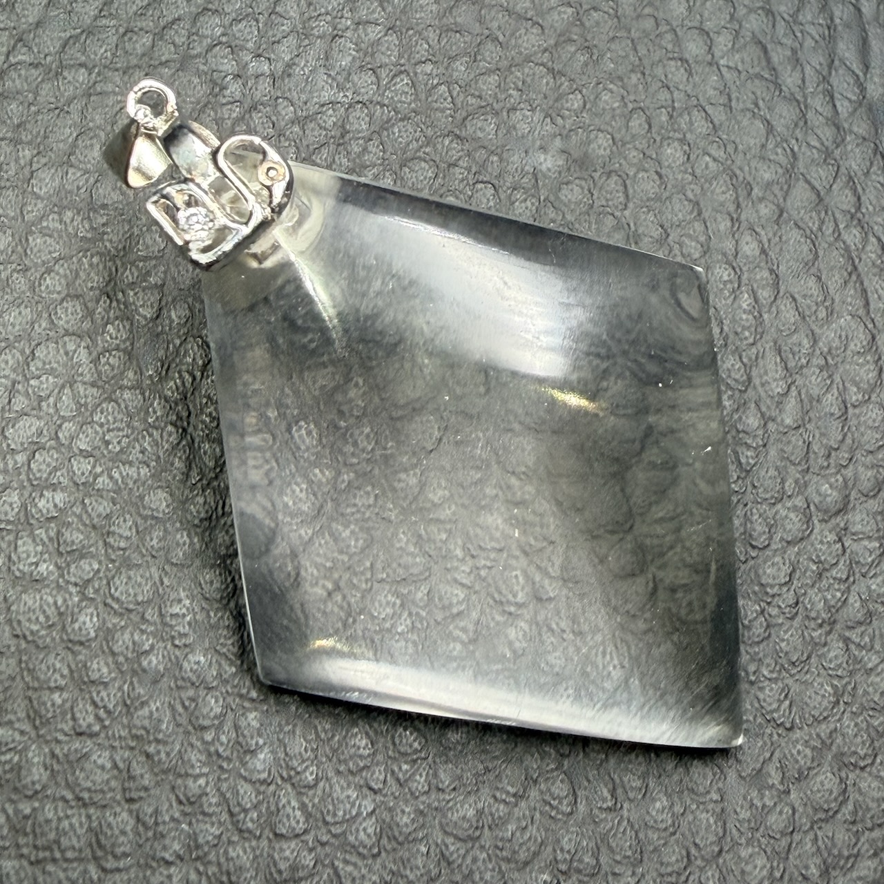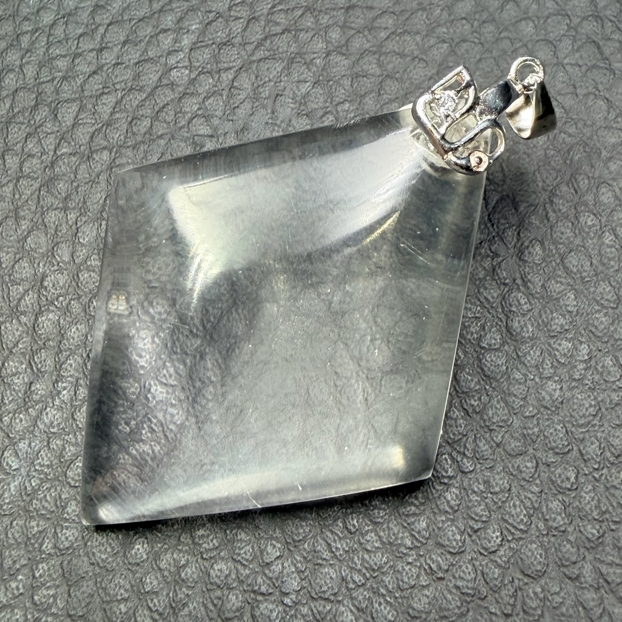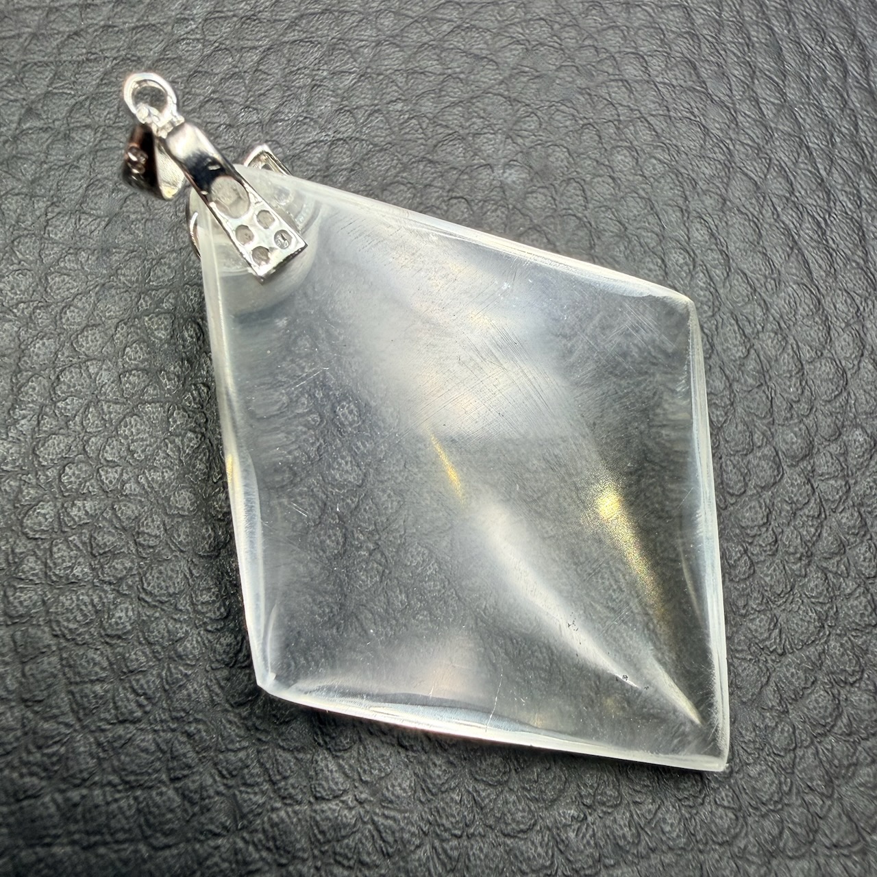 Dimensions du pendentif en cristal de roche hors bélière 4,6 cm sur 3,4 cm sur 0,8 cm.