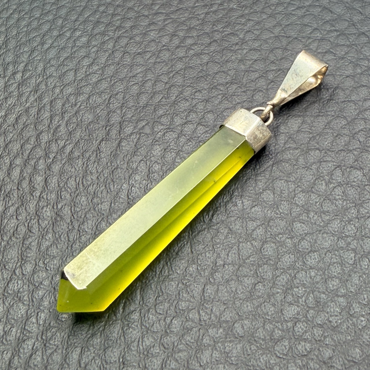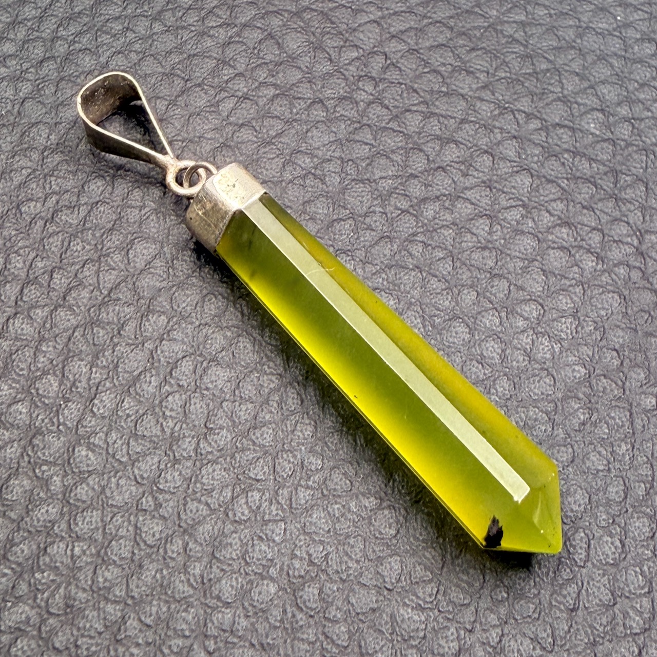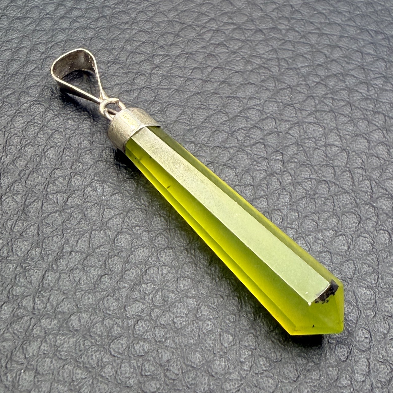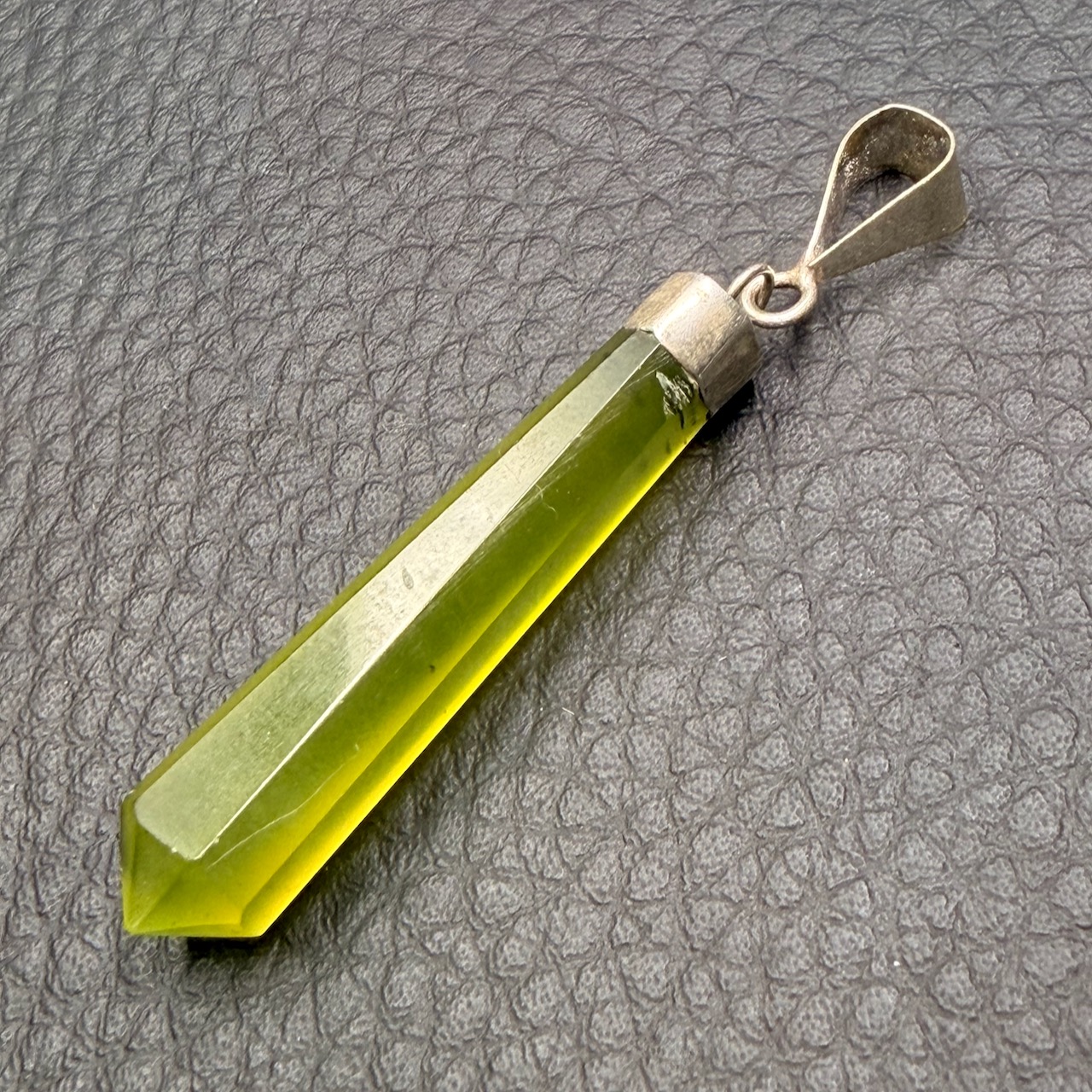 Taille du pendentif en grenat vert hors bélière: 4 cm sur 0,7 cm sur 0,8 cm.