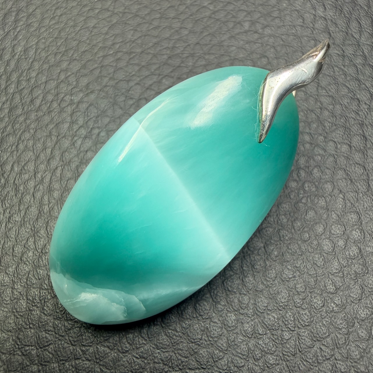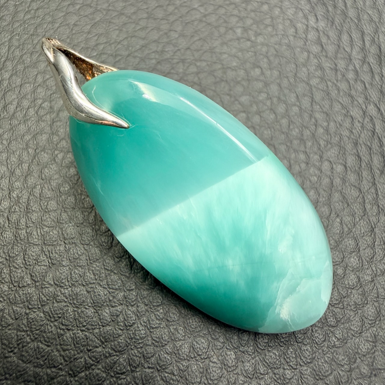 L’hémimorphite se distingue par ses cristaux prismatiques ou fibreux, souvent disposés en agrégats botryoïdaux (en forme de grappes). Sa dureté est de 4,5 à 5 sur l’échelle de Mohs, ce qui en fait un minéral relativement tendre, nécessitant un soin particulier lorsqu’il est monté en pendentif.