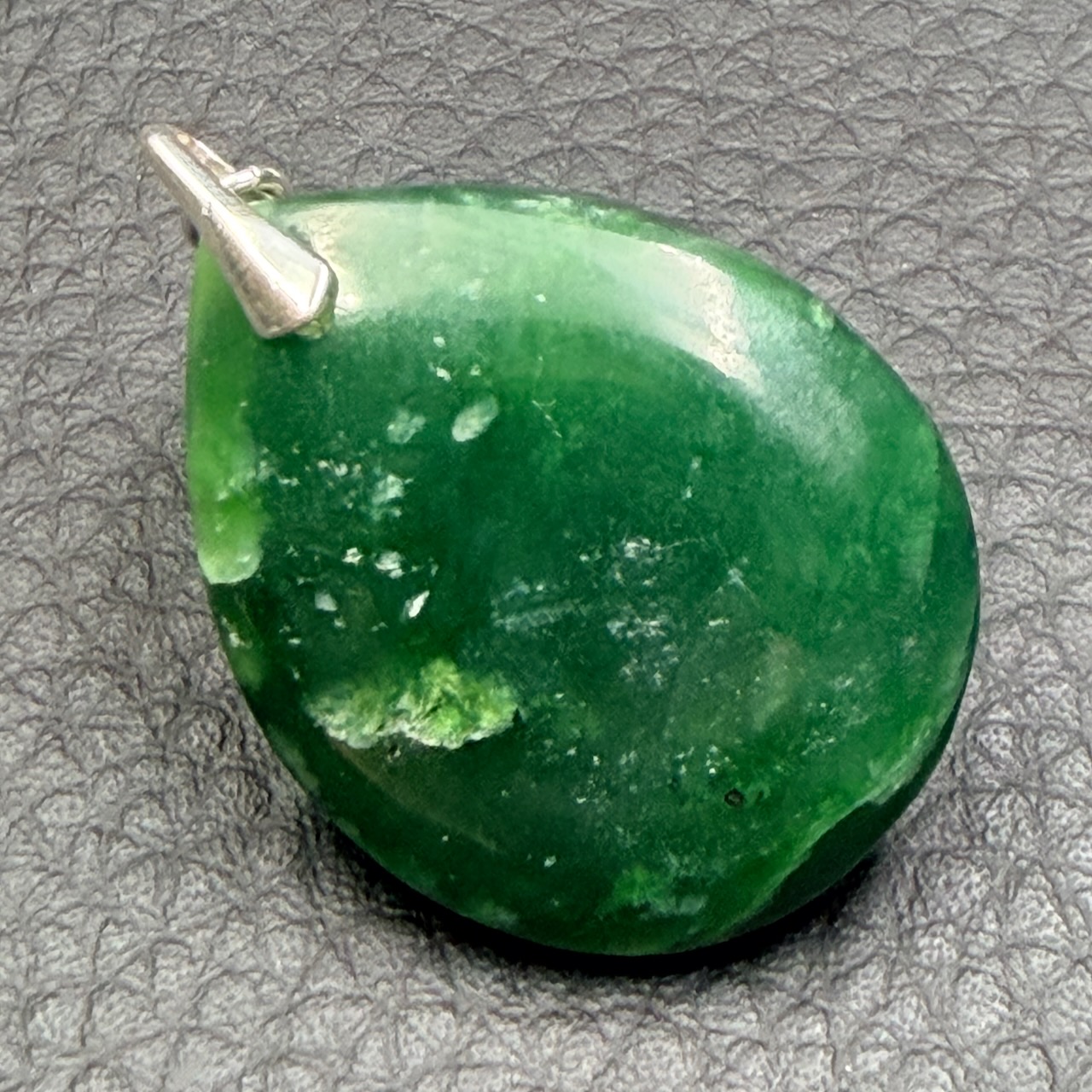 Taille du pendentif en jade hors bélière 3 cm sur 2,4 cm sur 0,7 cm.