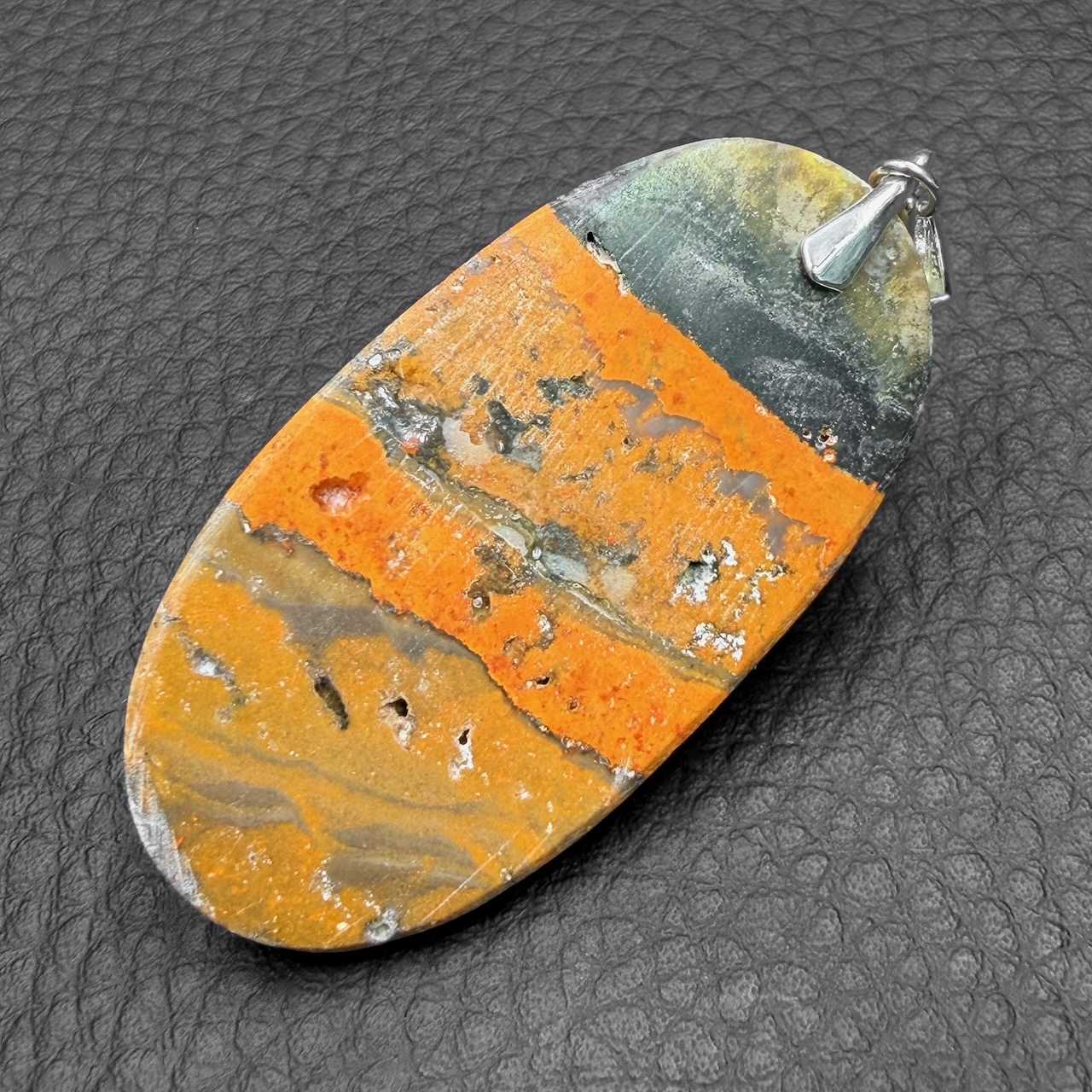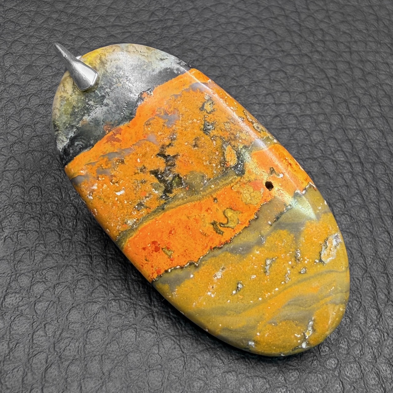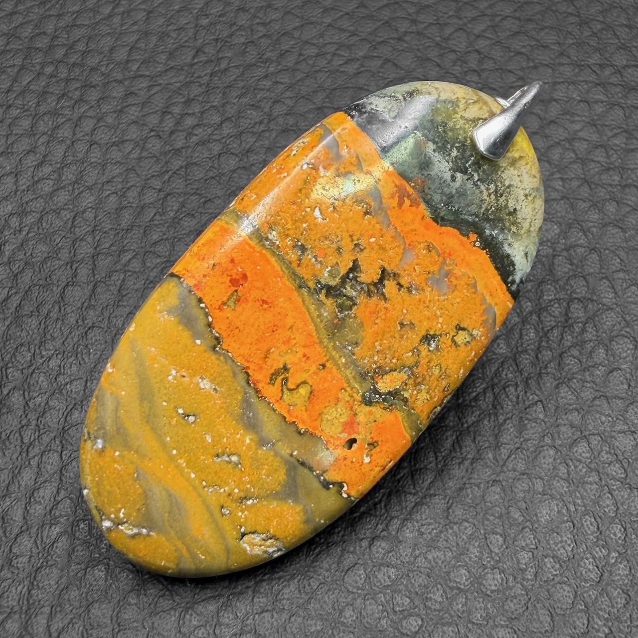 Taille du Pendentif en Jaspe Bumblebee hors bélière 5 cm sur 2,5 cm sur 0,6 cm.