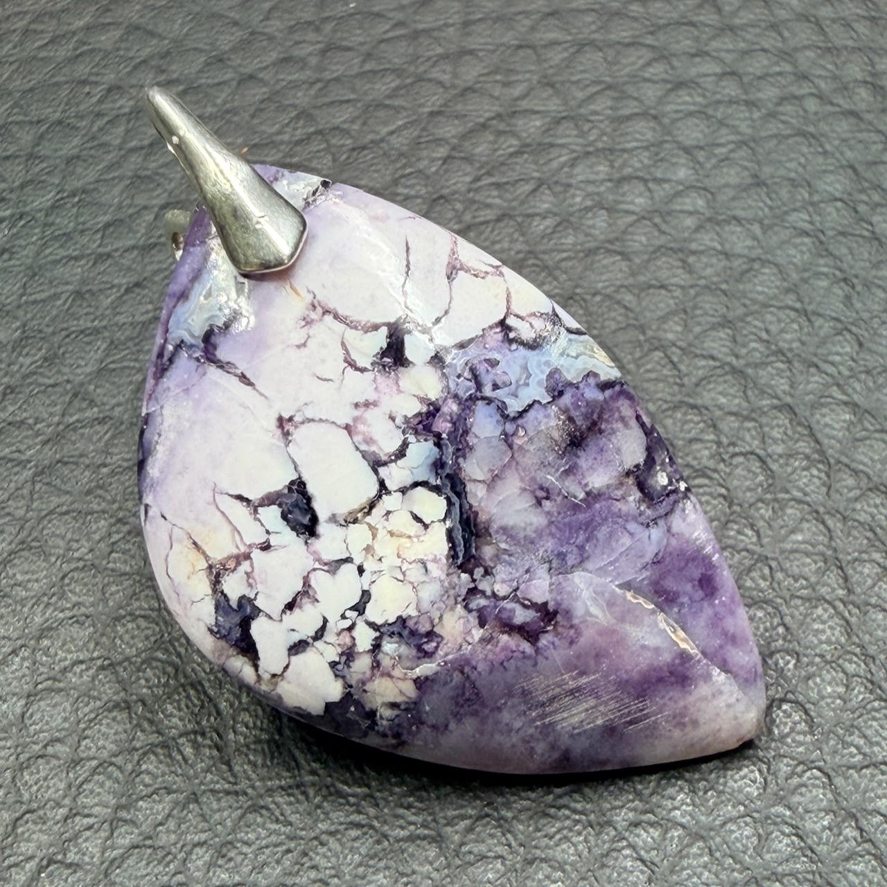 Le pendentif en jaspe Tiffany se distingue par son esthétique singulière, marquée par des contrastes nets entre des teintes claires et des lignes sombres structurées.