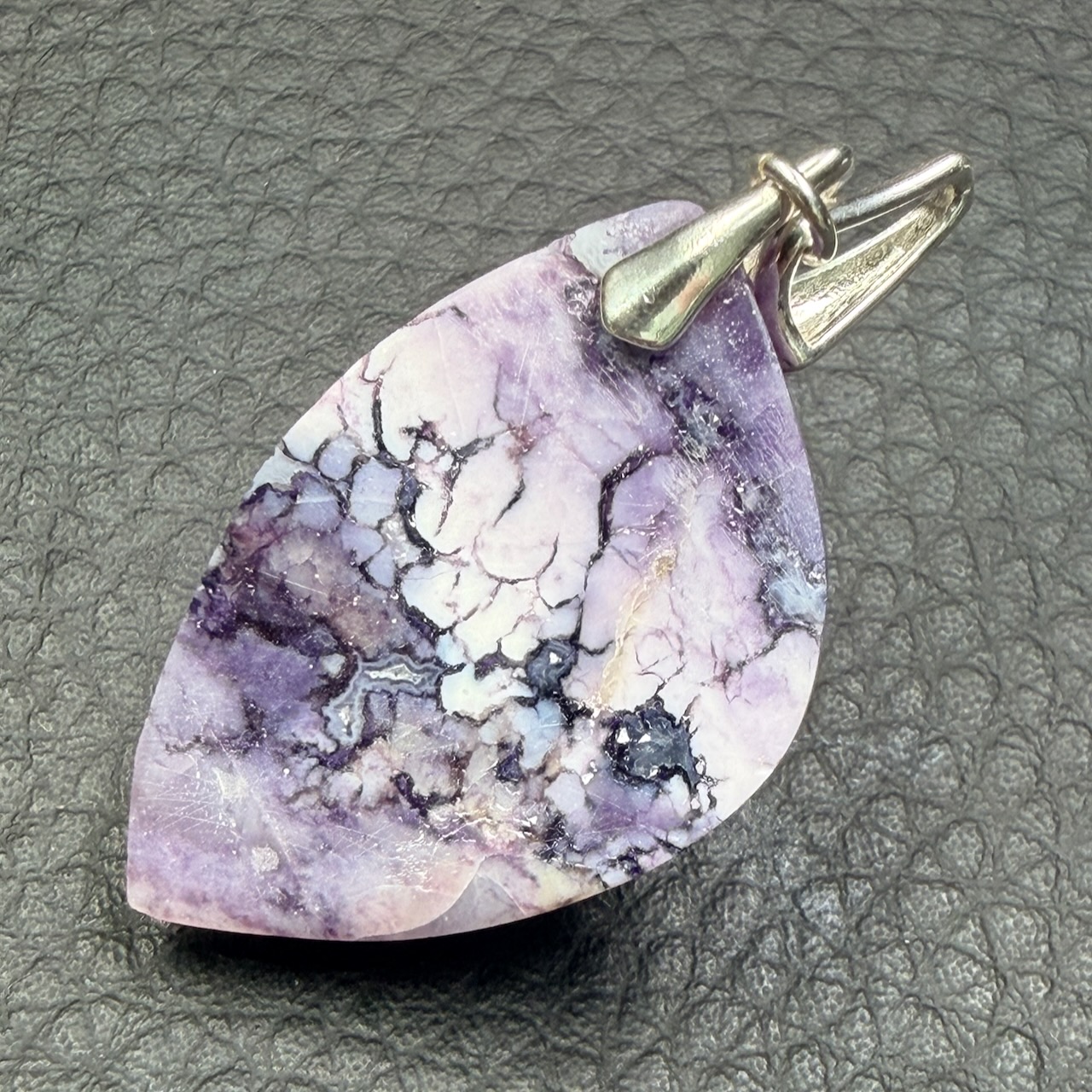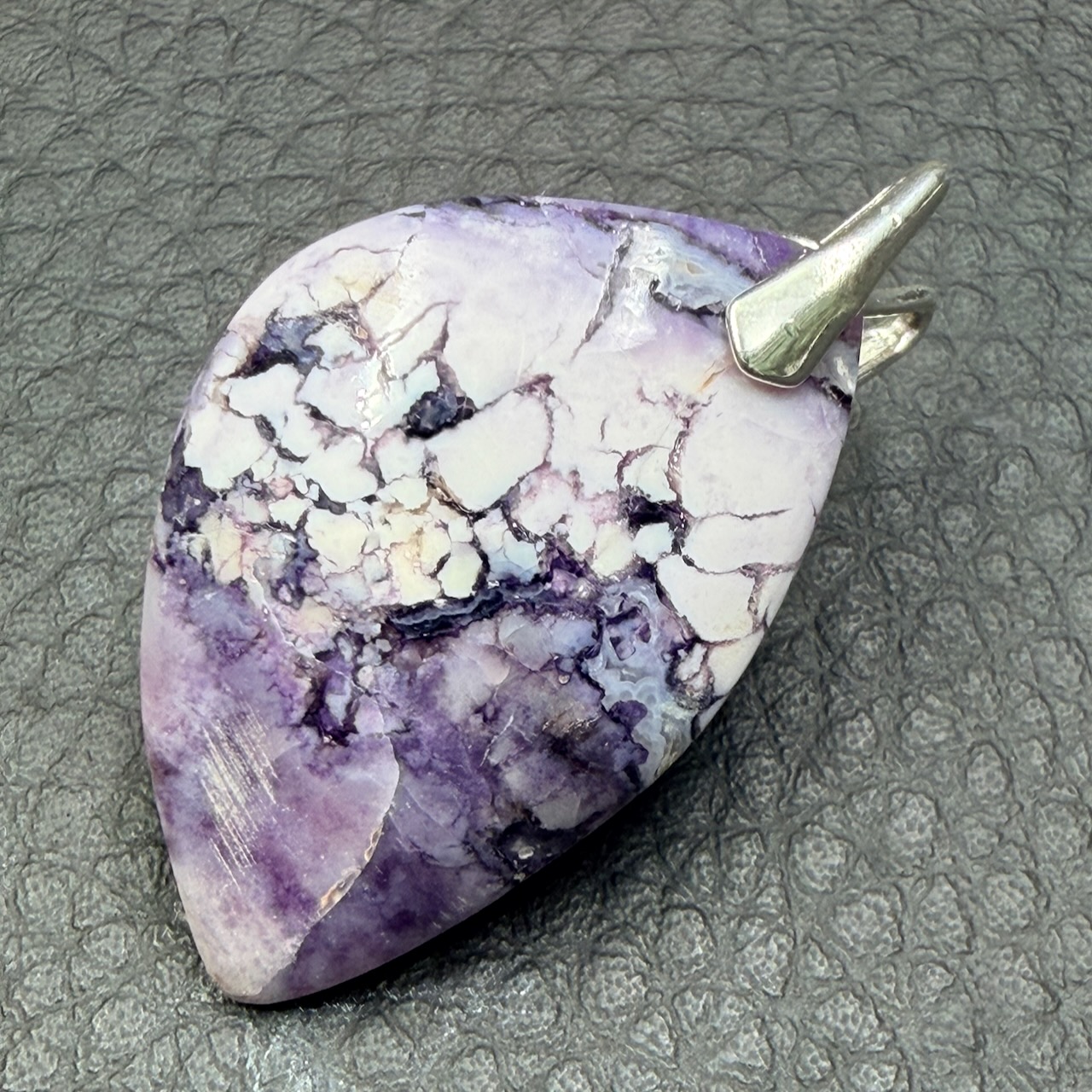 Le jaspe Tiffany présente une dureté d’environ 6,5 à 7 sur l’échelle de Mohs, ce qui lui confère une bonne résistance à l’usure dans le cadre d’un usage en pendentif. Sa structure dense et compacte permet un polissage soigné, révélant pleinement ses motifs naturels.