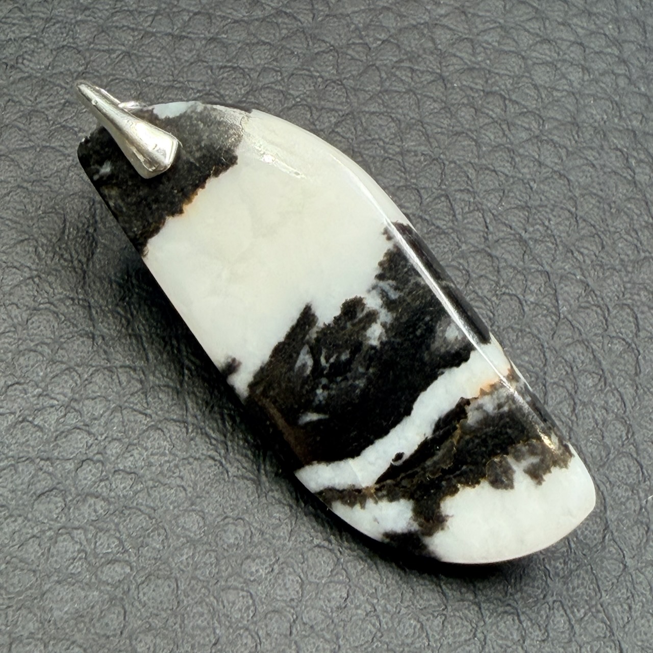 Taille du Pendentif en Jaspe Zébre hors bélière 4 cm sur 1,6 cm sur 0,4 cm.