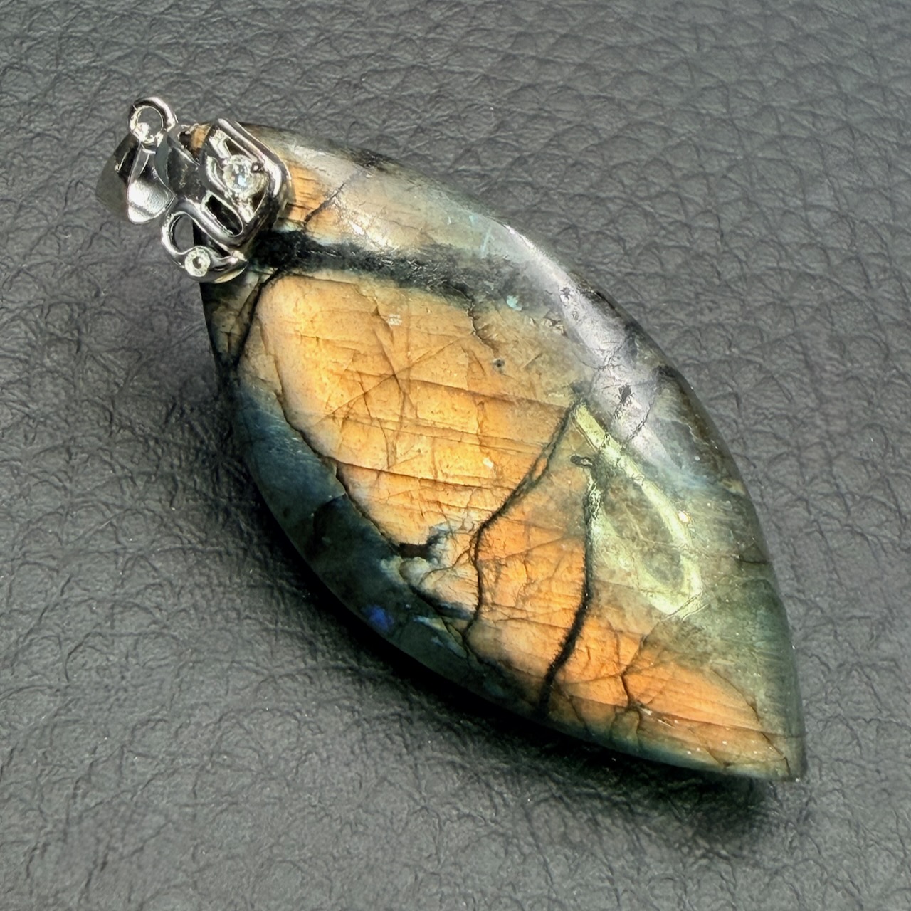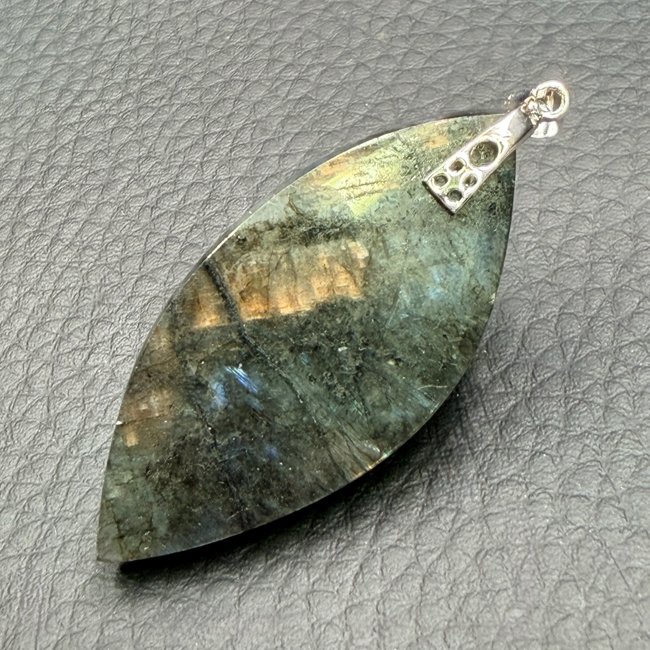 Sublimant les teintes de l’arc-en-ciel, le pendentif en labradorite dorée se présente comme une éclatante révélation de cette pierre exceptionnelle.