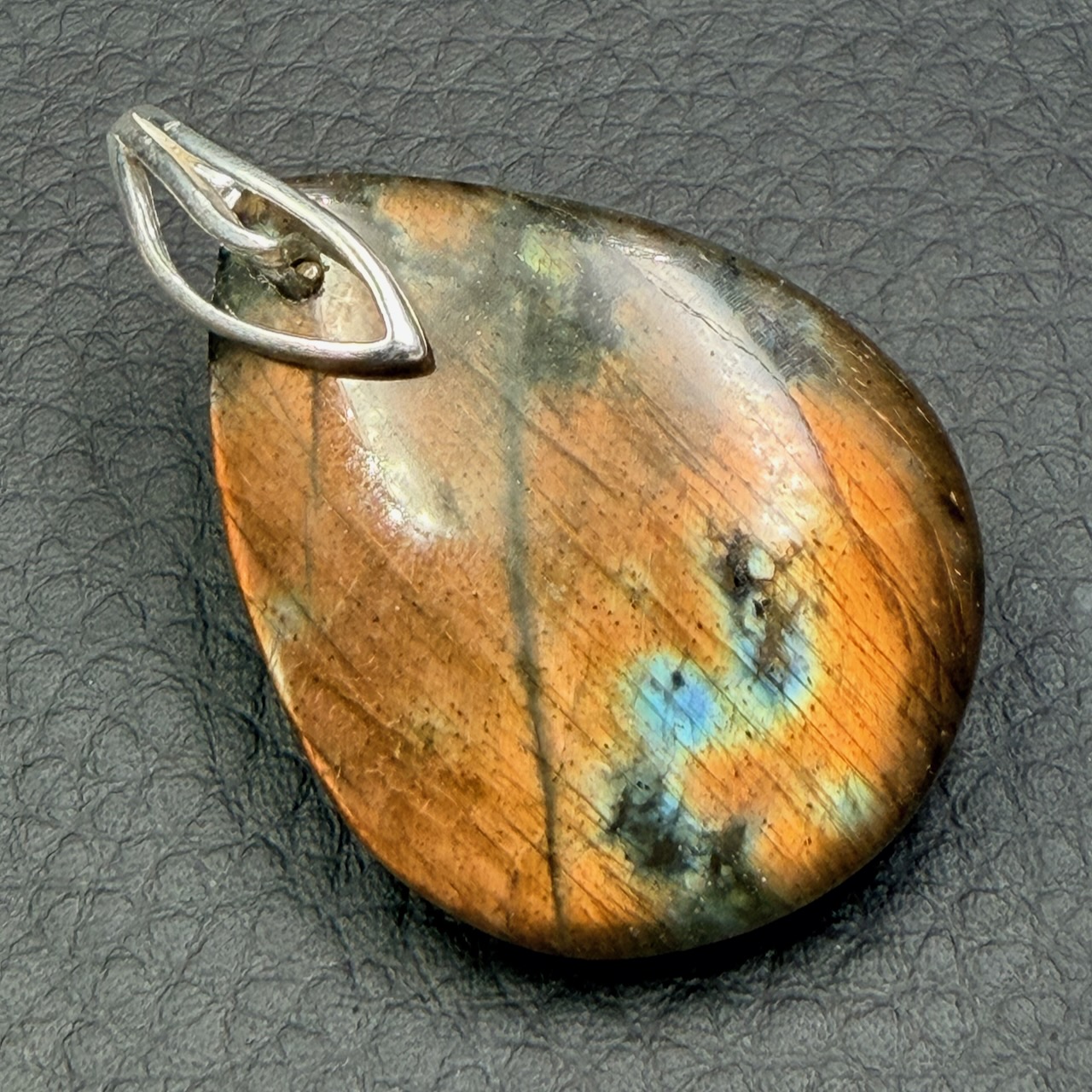Sublimant les teintes de l’arc-en-ciel, le pendentif en labradorite dorée se présente comme une éclatante révélation de cette pierre exceptionnelle.