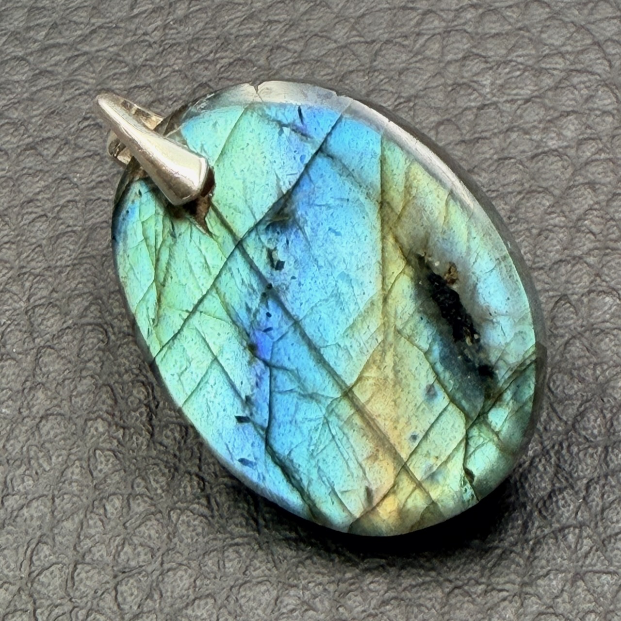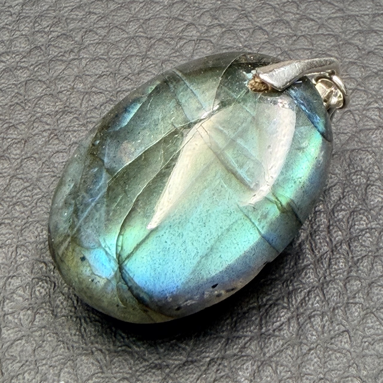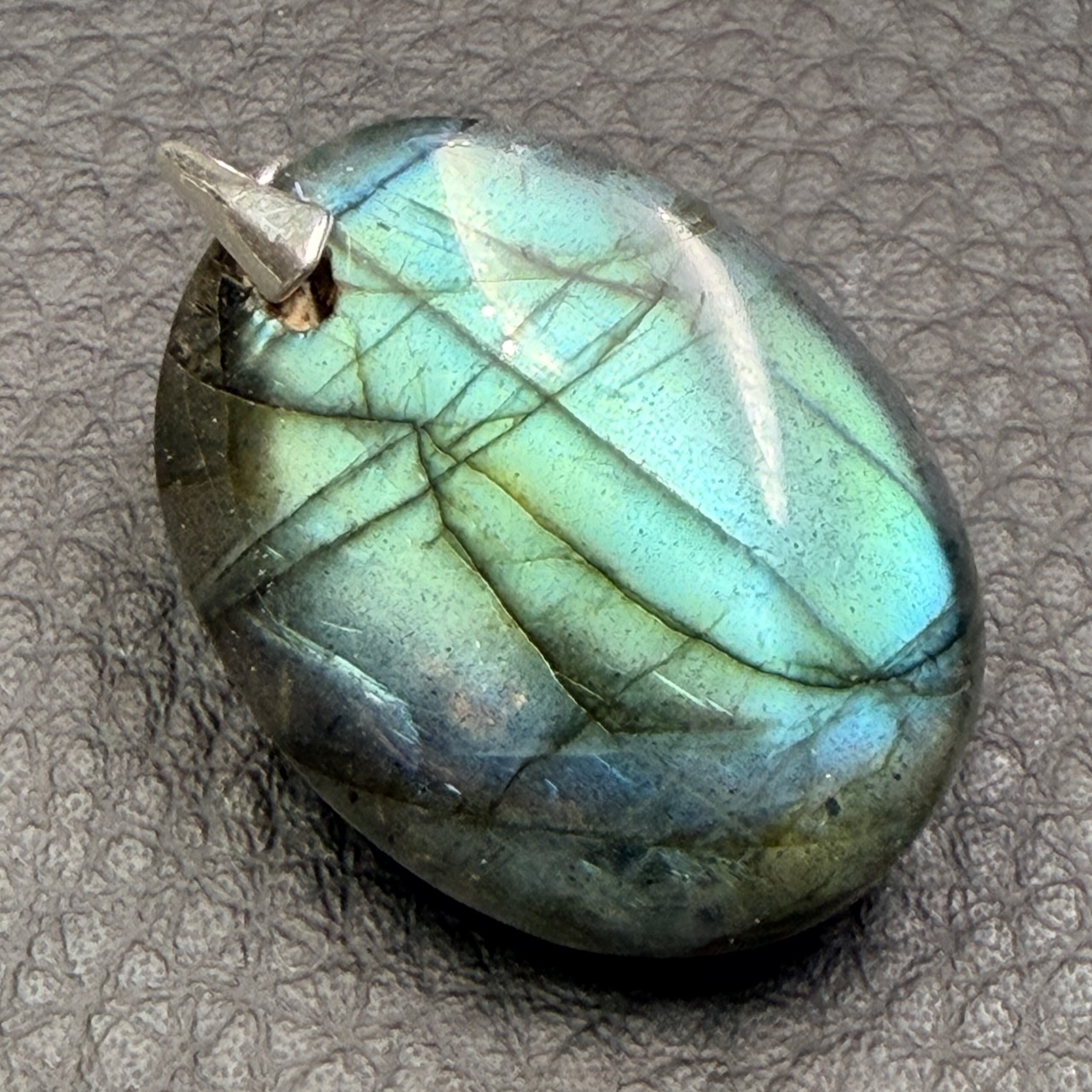 Taille du Pendentif en Labradorite Verte hors bélière 2,8 cm sur 2,2 cm sur 0,8 cm.